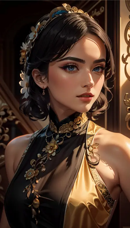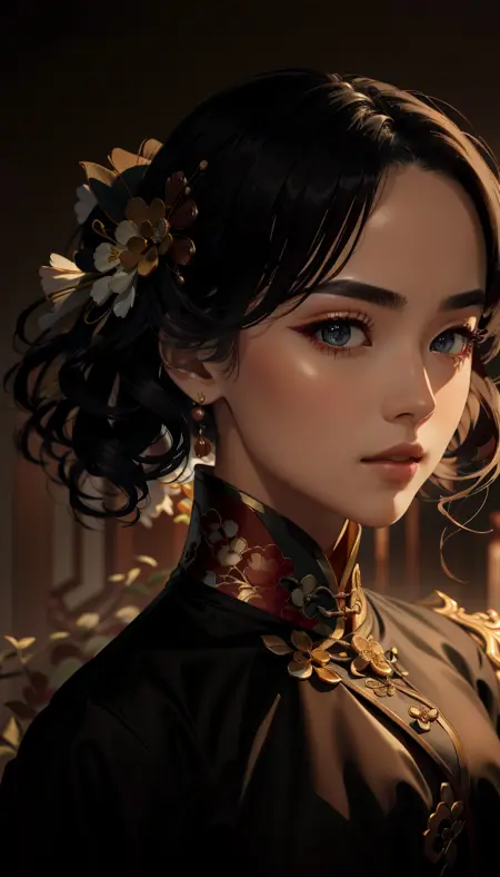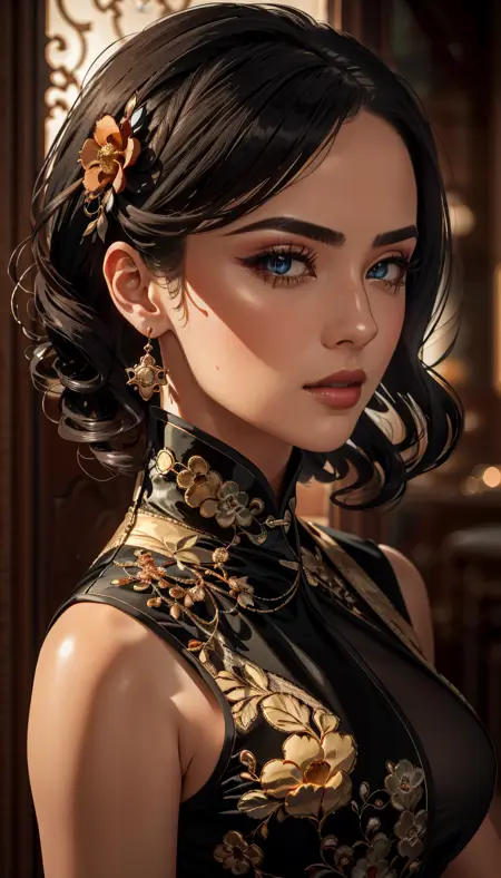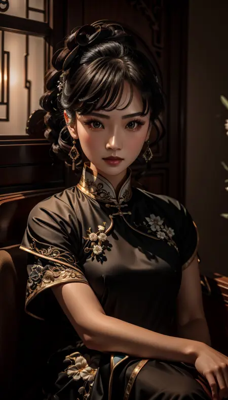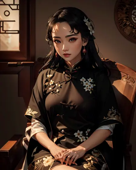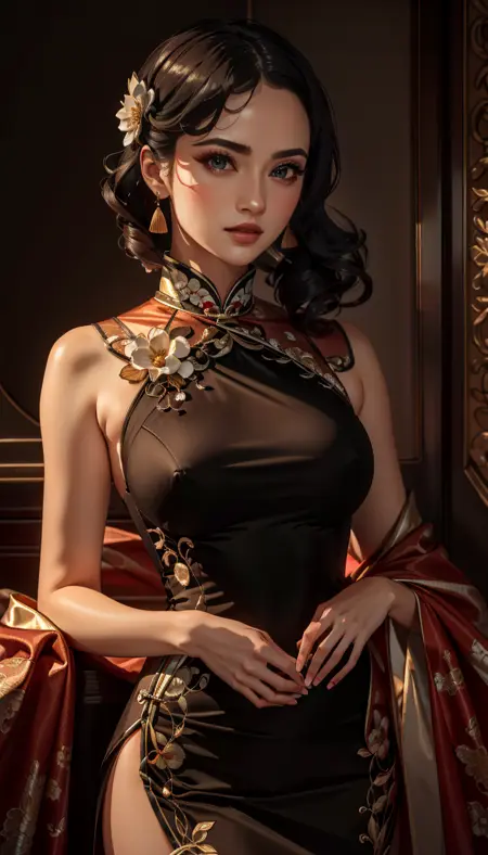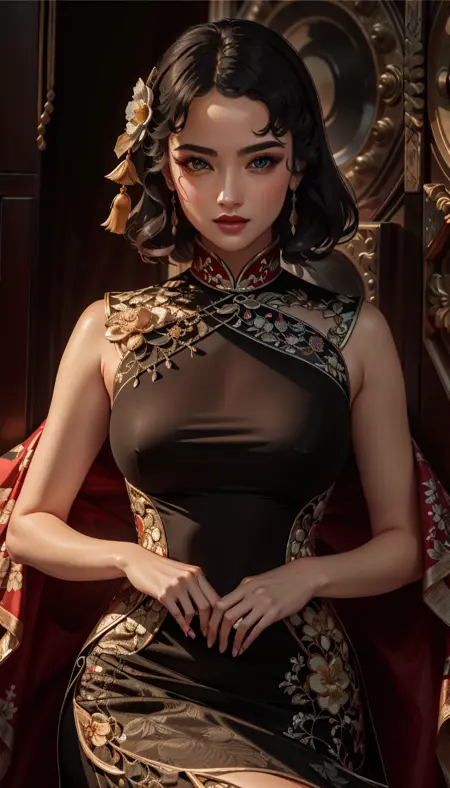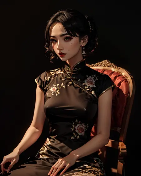 old-shanghaibeauty, 1girl, 写实,红唇,口红,直视观众,妆容,{ 红 | 白 | 黑 | 紫 | 粉 | 黄 | 深蓝 } 中式服装,侧开衩,眼影,