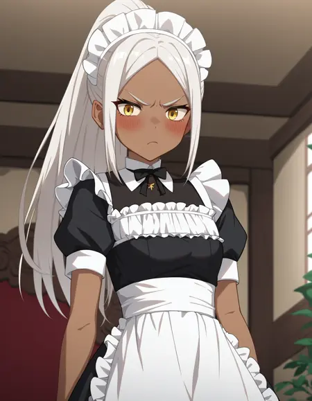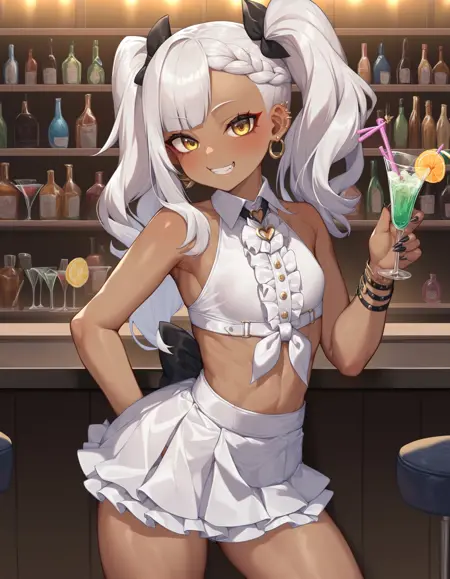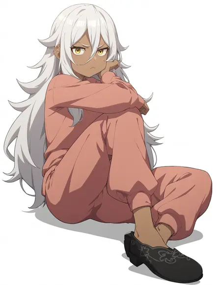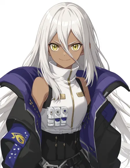 namu snowbreak,1girl,solo,long hair,dark-skinned female,dark skin,white hair,jacket,hair between eyes,yellow eyes,shirt,off shoulder,open clothes,white shirt,