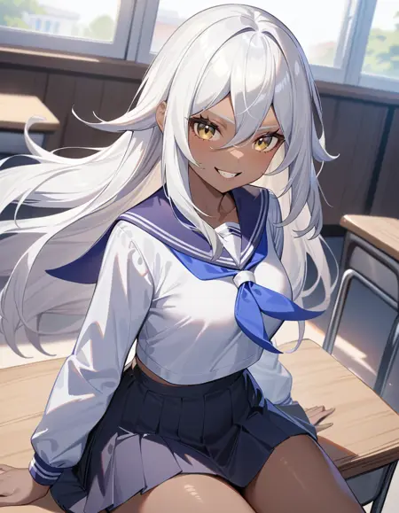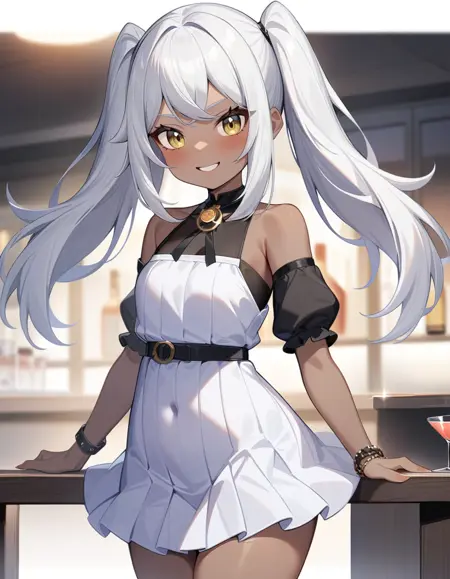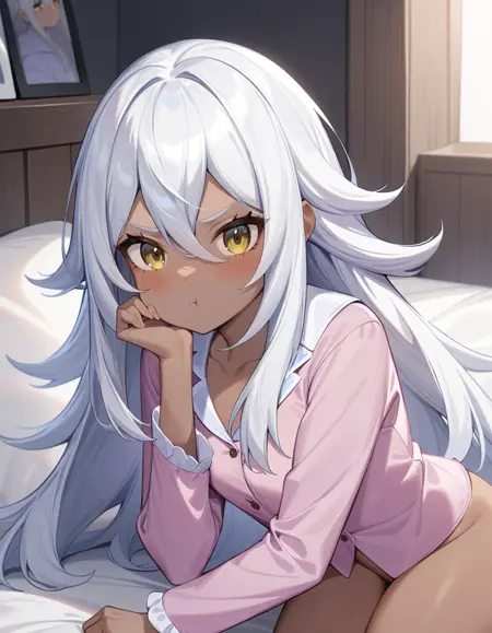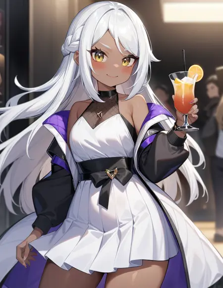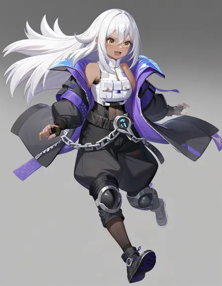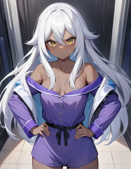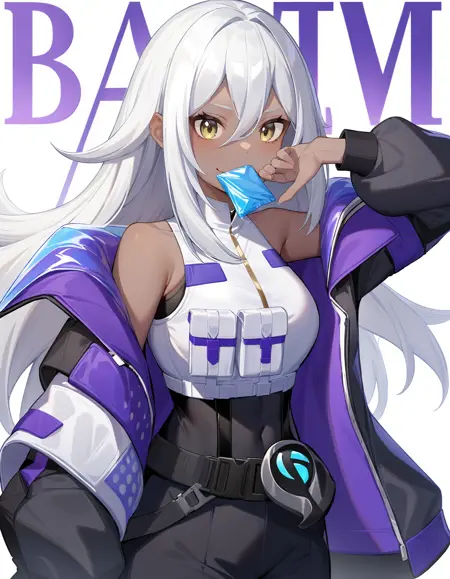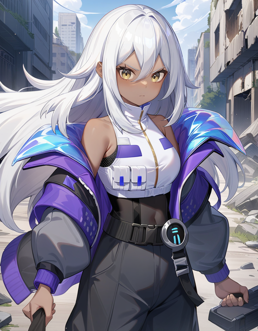 namu snowbreak,1girl,solo,long hair,dark-skinned female,dark skin,white hair,jacket,hair between eyes,yellow eyes,shirt,off shoulder,open clothes,white shirt,