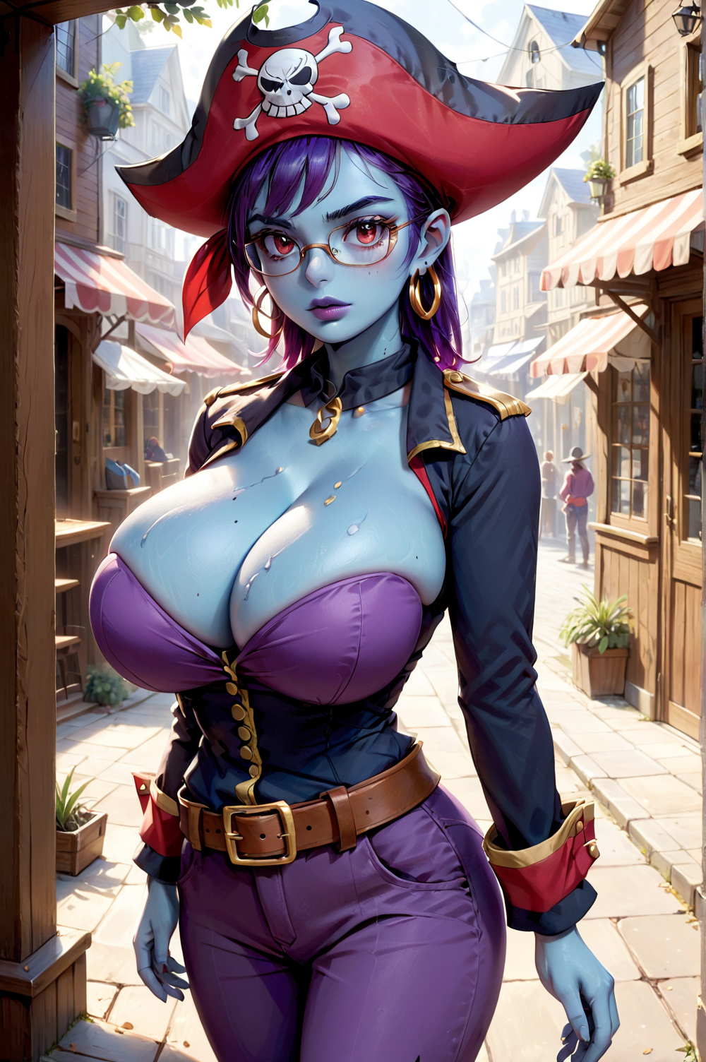 riskyboots, risky boots, risky_boots, red eyes, purple hair, earrings, colored skin, skull, blue skin, purple lips, pirate, skull and crossbones,