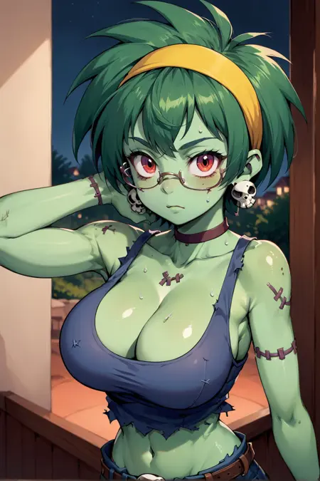 rottytops, short hair, bangs, red eyes, green hair, colored skin, green skin, zombie, yellow hairband, skull earrings,