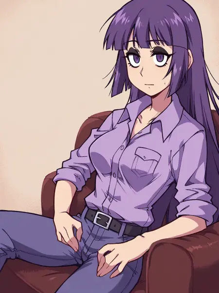 衣装C: パープルのシャツ、袖をまくった状態、パープルのズボン、ベルト、
