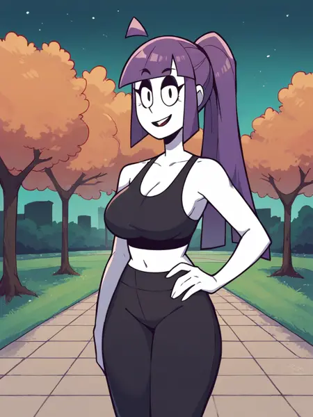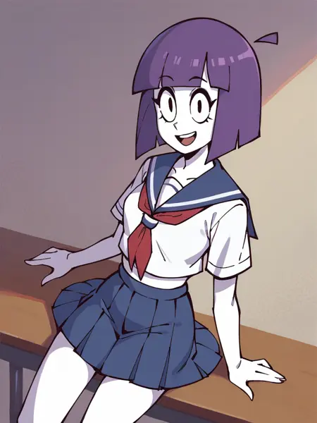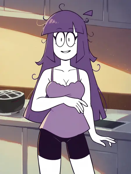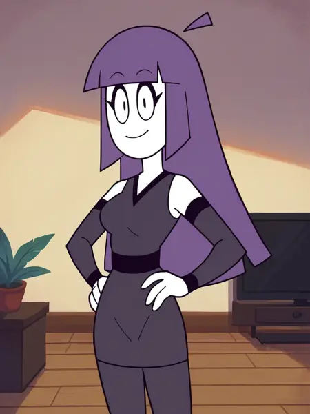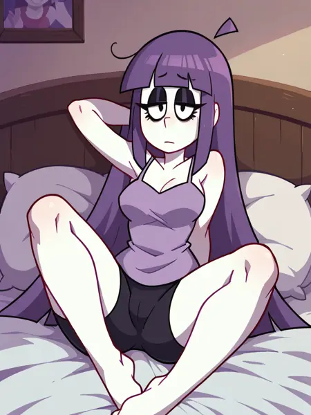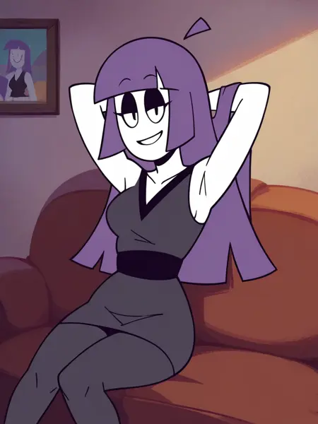 キーワード: lila sm、ロングヘア、パープルヘア、ストレート前髪、浮き出たahoge、ブラックアイシャドウ、