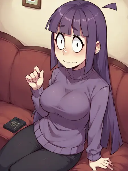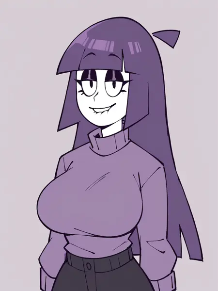 衣装B: パープルのセーター、タートルネック、ブラックのズボン、