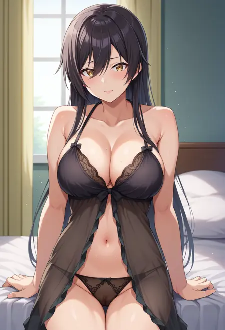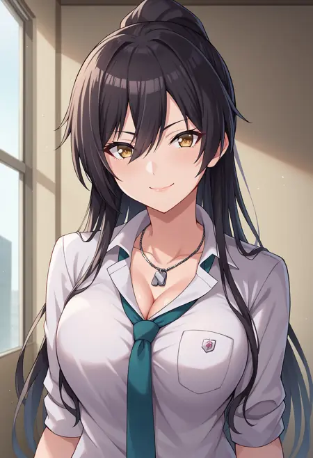 shirase sakuya, large breasts, black hair, long hair, high ponytail, yellow eyes