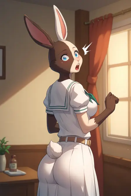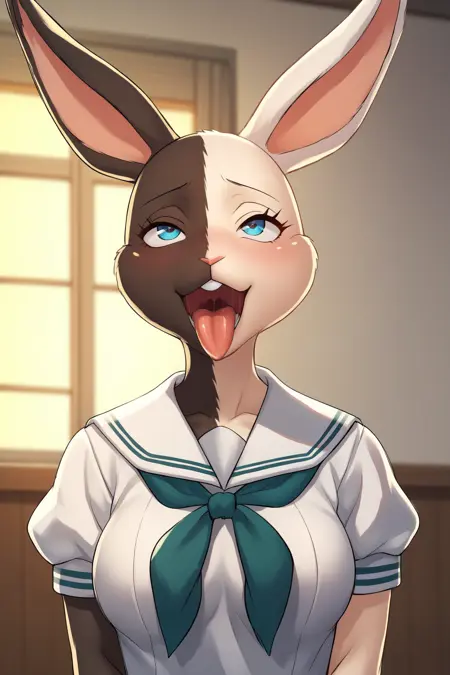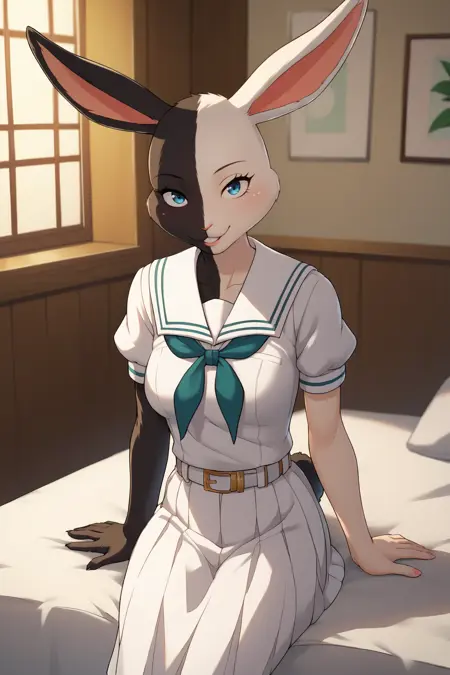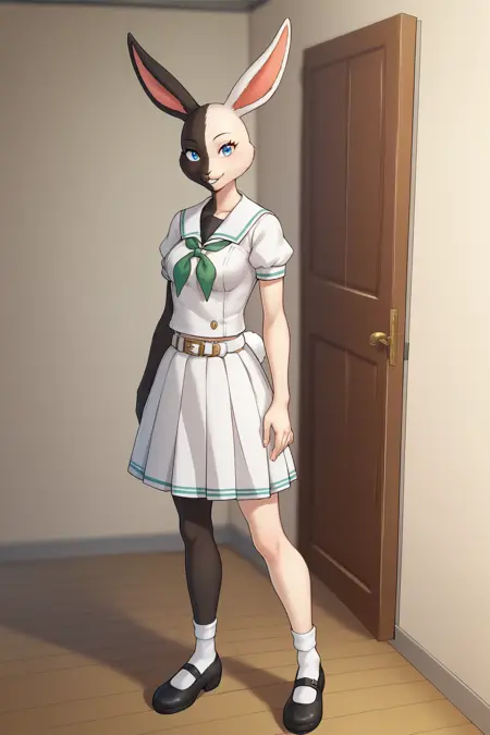➜ MizuchiBSXL, anthro furry, furry female, half color on body fur, black fur, (white fur), two-tone fur, blue eyes, animal ears, rabbit ears, rabbit tail, snout, medium breasts, serafuku, white sailor collar, green neckerchief, white shirt, puffy sleeves, short sleeves, belt, white skirt, socks, black shoes