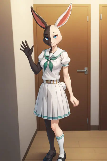 ➜ MizuchiBSXL, 인스로 퓨리, 퓨리 여성, 몸털에 반색, 검은 털, (하얀 털), 이색 털, 파란 눈, 동물 귀, 토끼 귀, 토끼 꼬리, 코, 중간 정도의 가슴, 세라후쿠, 흰색 선원 칼라, 녹색 넥커치프, 흰색 셔츠, 풍성한 소매, 짧은 소매, 벨트, 흰색 치마, 양말, 검은 신발
