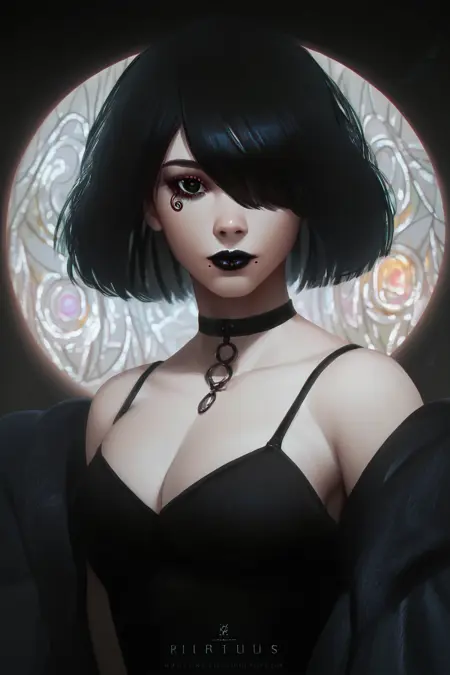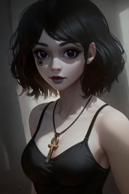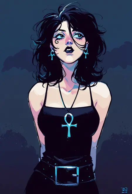 基本的な衣装:D_endless、1人の女性、薄い肌、黒髪、中長髪、額に髪がかかる、黒目、黒い唇、顔のタトゥー、十字のネックレス、黒いトップス、肩出し、黒いパンツ、デニム、釘付きベルト、手袋