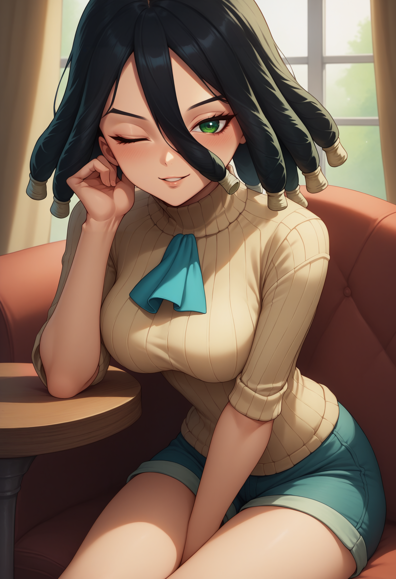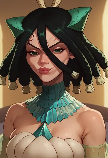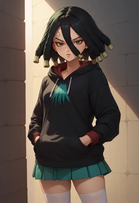 Kirisame, green eyes, black hair, dreadlocks, hair between eyes