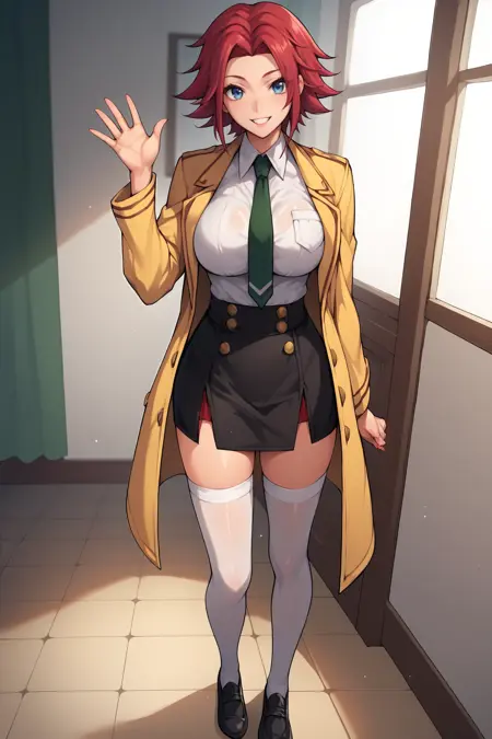 ➜ KallenStadfeldXL, 蓝眼睛, 红发, 短发, 中分刘海, 大胸部, 绝对领域, 带领子的衬衫, 黄色夹克, 白色衬衫, 绿色领带, 黑色短裙, 白色过膝袜, 黑色鞋子