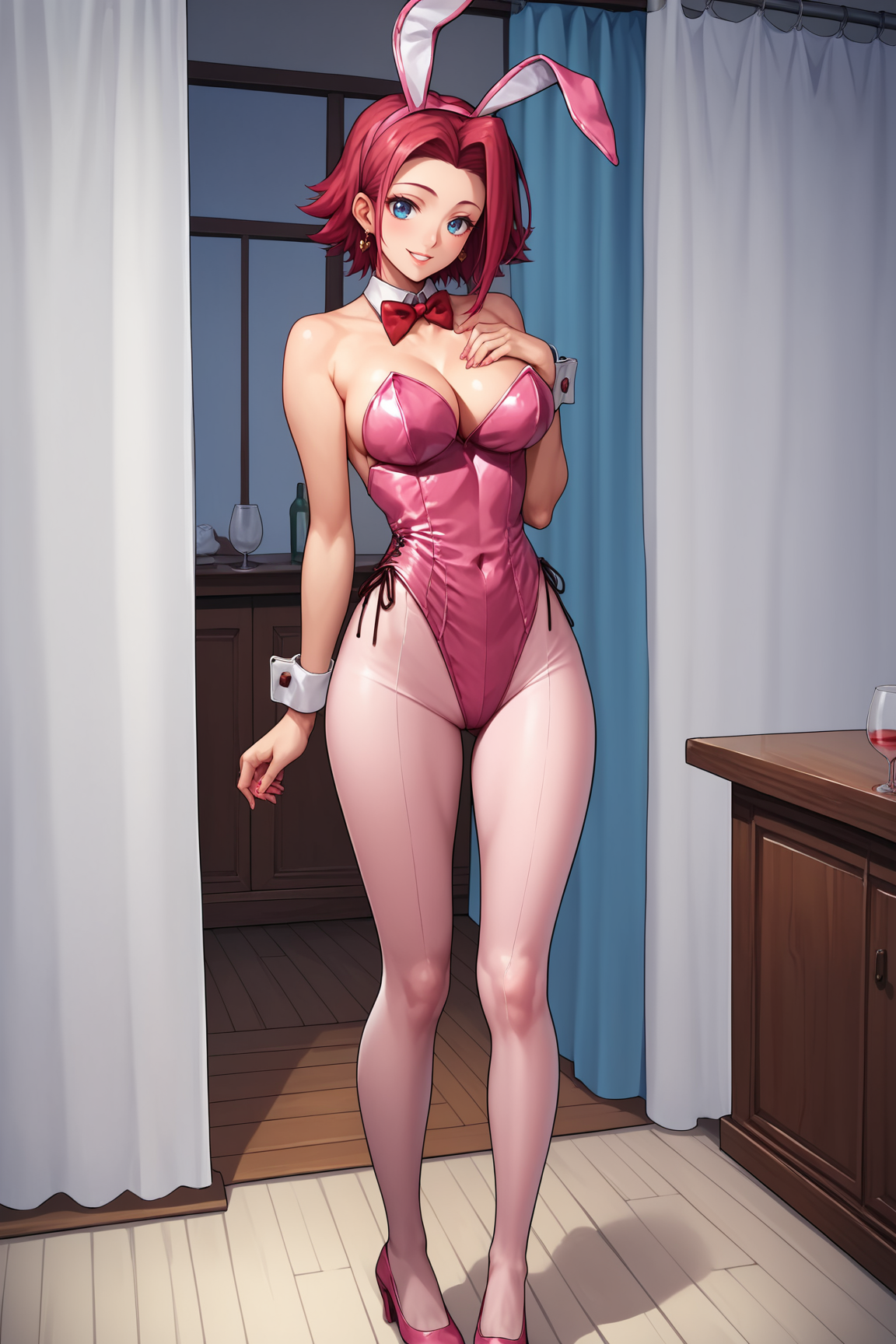 ➜ KallenStadfeldXL, 蓝眼睛, 红发, 短发, 中分刘海, 大胸部, 兔耳, 红色蝴蝶结, 粉色花花公子兔女郎, 粉色紧身衣, 白色腕套, 粉色连裤袜, 粉色鞋子
