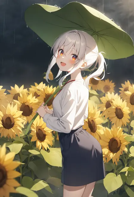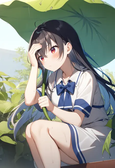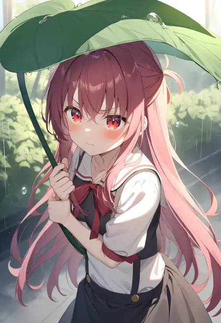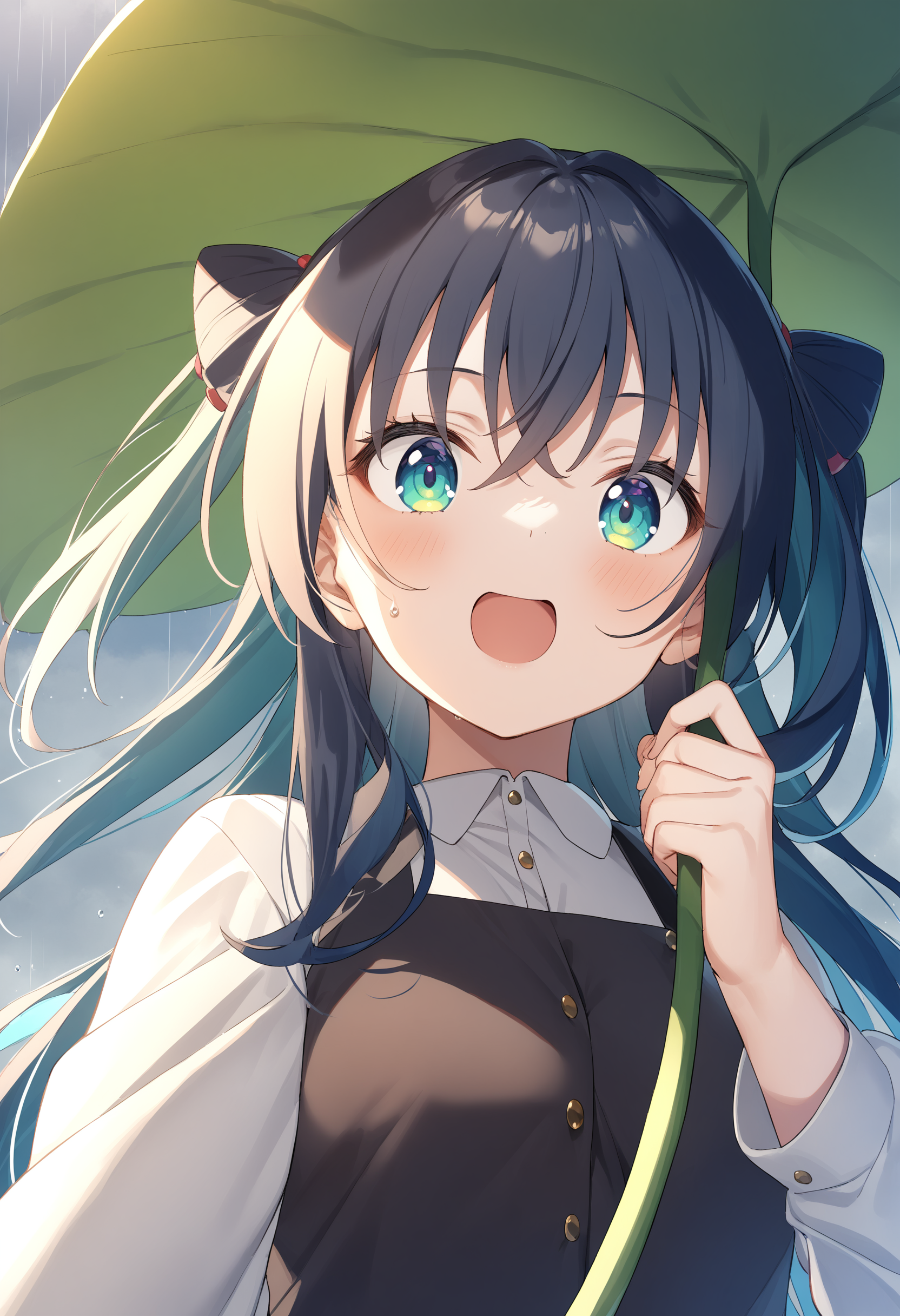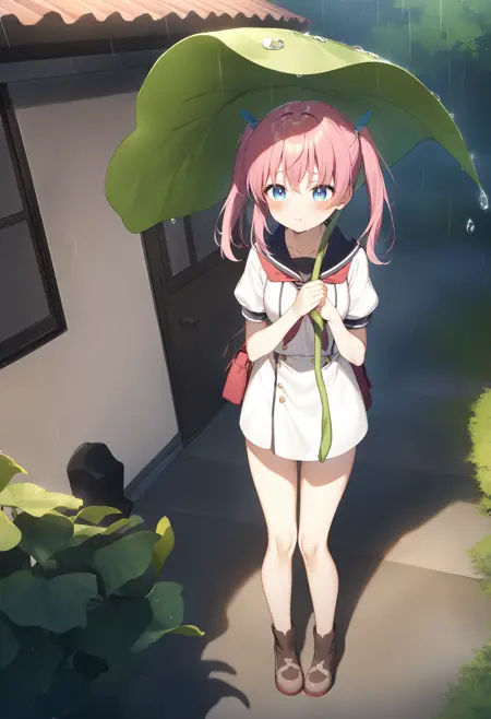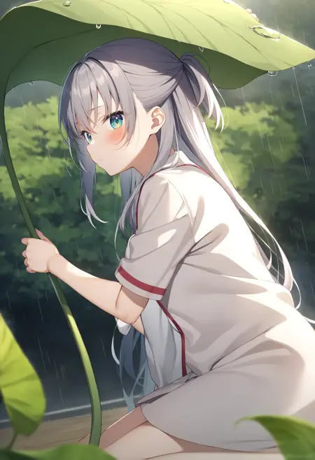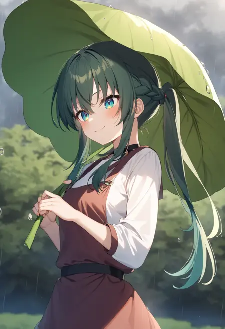 虽然原本已进行过训练,但造型效果不佳,因此通过加入holding leaf、water drop、rain、outdoors等元素进行修正。