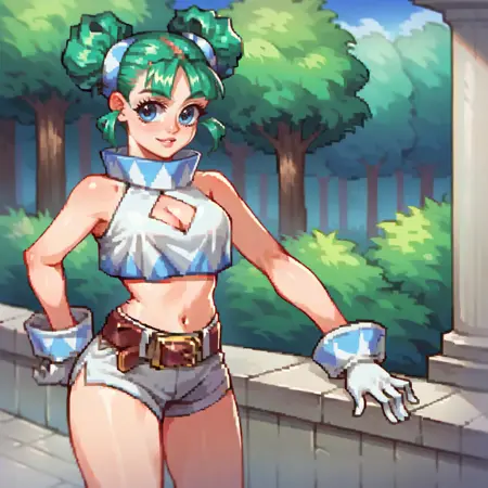 더블 뚜 bun, 크롭 탑, 벨트, 흰 장갑, 짧은 반바지, 가슴 노출 컷아웃