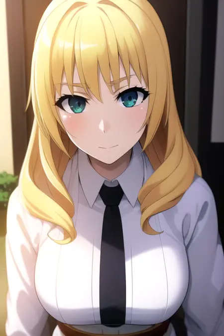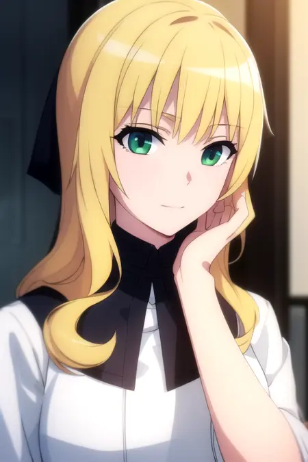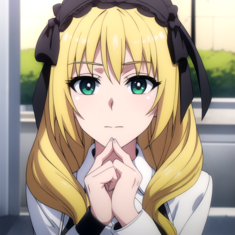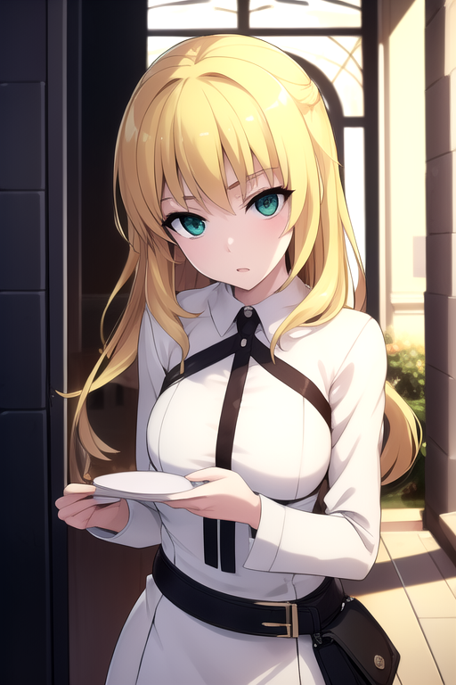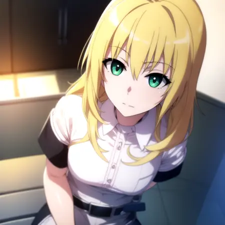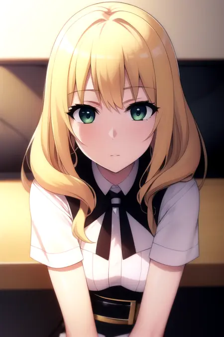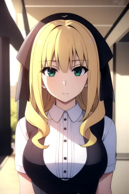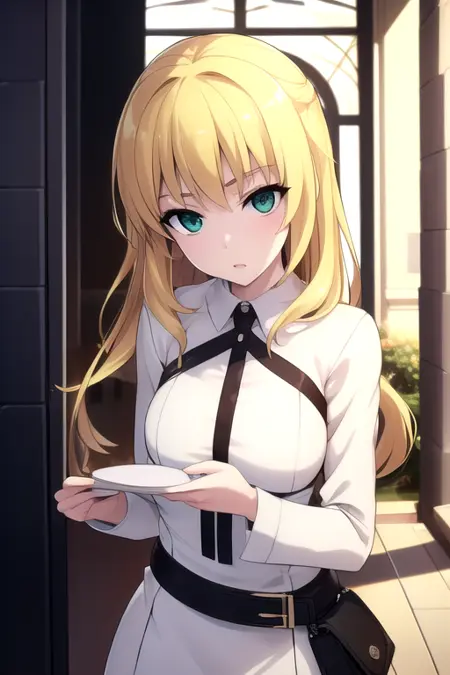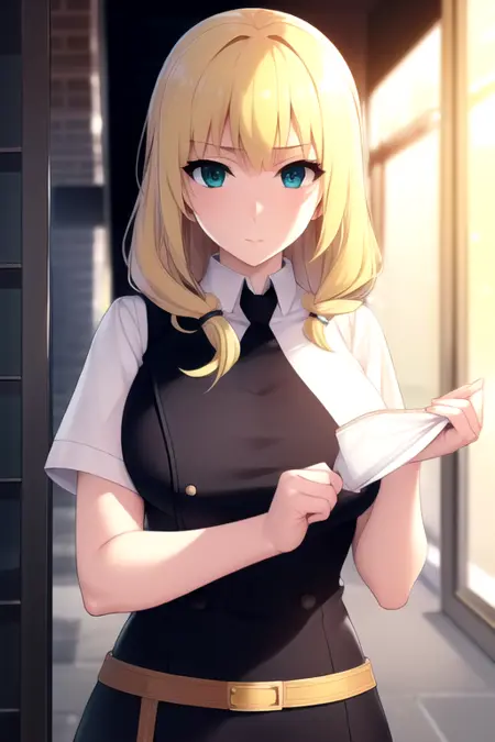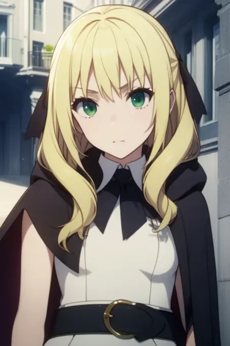 Green eyes, blond hair, short hair, girl, big red belt, black cape, garters