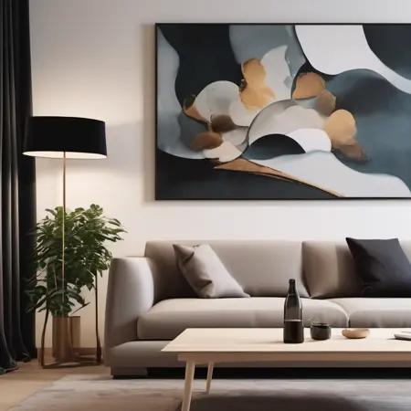 indoor, (((modern minimalist style))), a living room, a warm atmosphere, there is a coffee table next to the long sofa, an irregular table, there are interesting art paintings hanging on the wall, . 35mm photograph, film, bokeh, professional, 4k, highly detailed