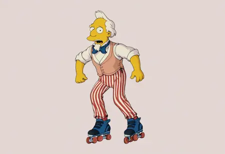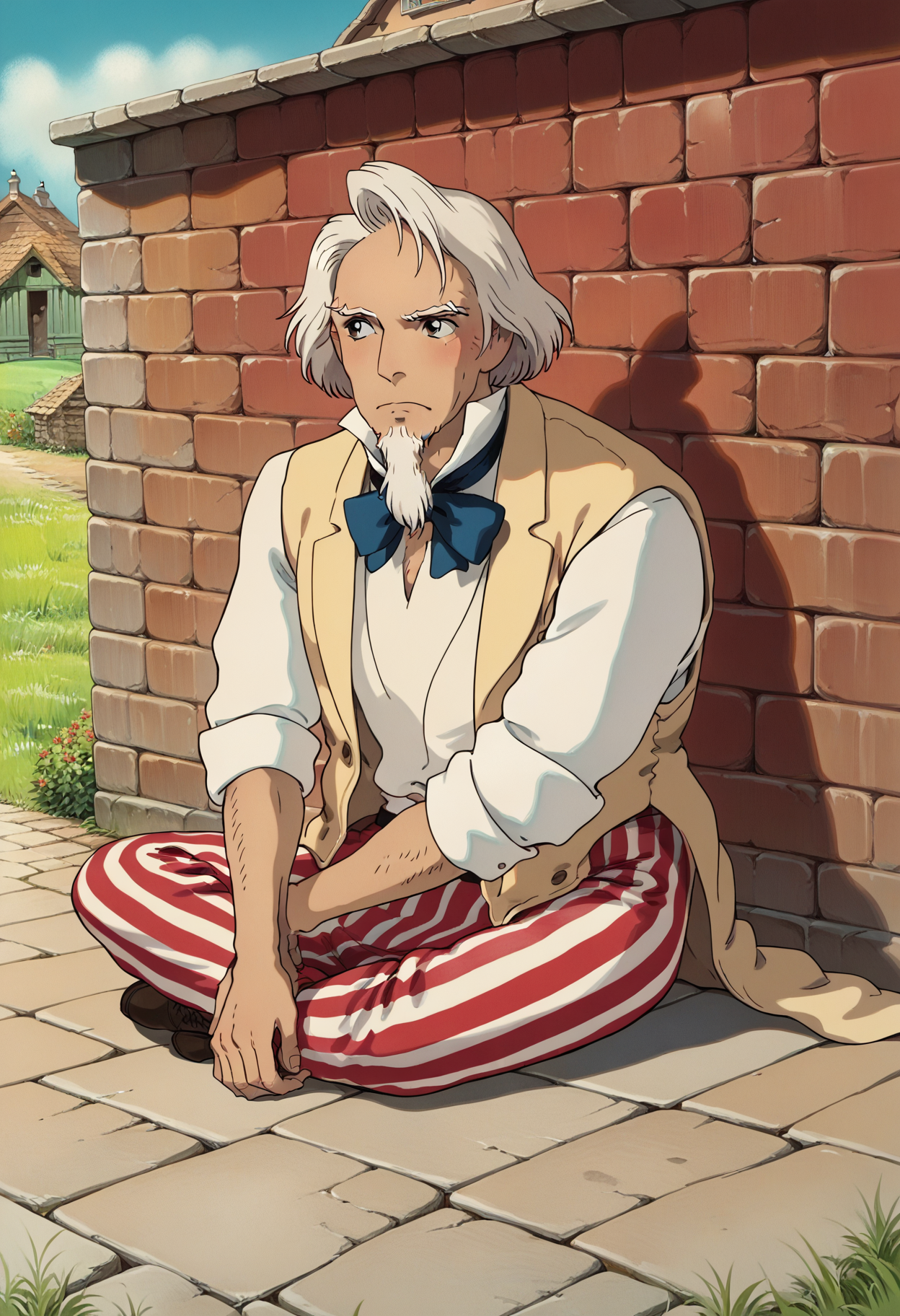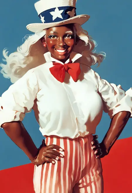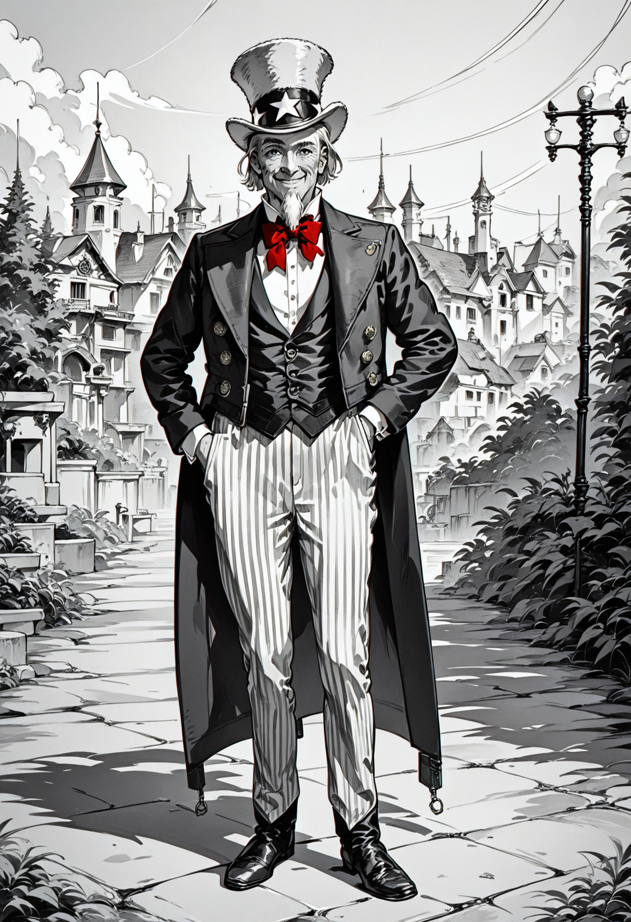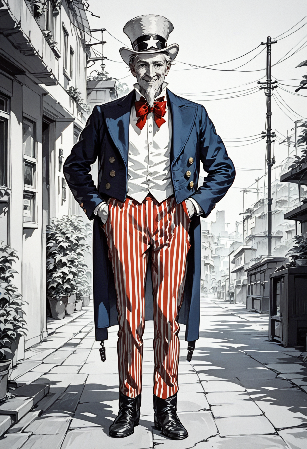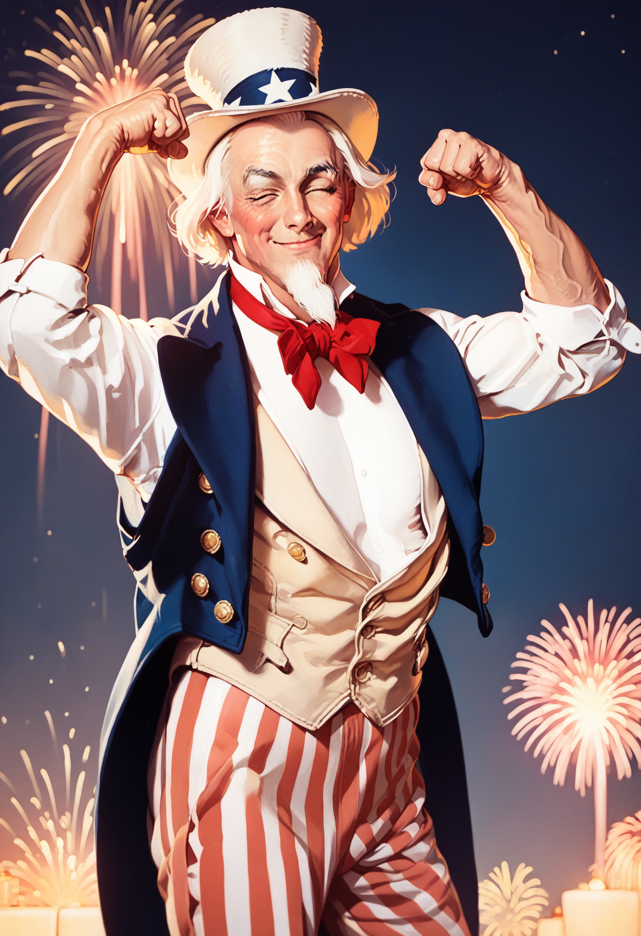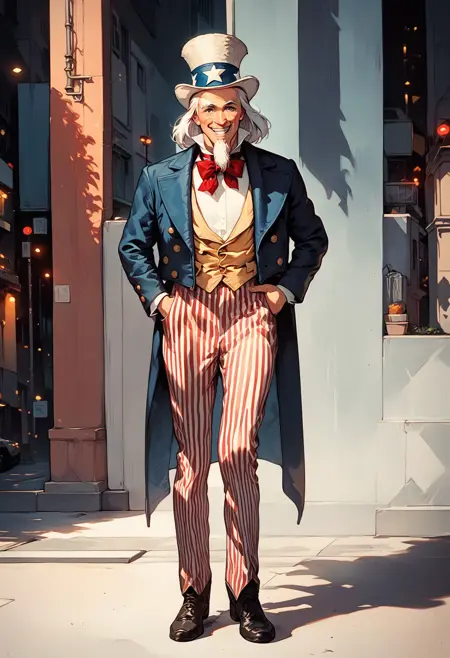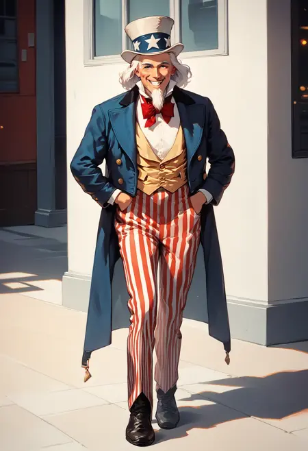 uncle sam, 1boy, solo, white hair, long goatee, red vertical-striped pants, blue tailcoat, white top hat, yellow vest, (blue hat band with stars:0.5), white shirt, (black boots:0.5), red bowtie, boot clips