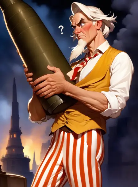 uncle sam, 1boy, solo, white hair, long goatee, red vertical-striped pants, blue tailcoat, white top hat, yellow vest, (blue hat band with stars:0.5), white shirt, (black boots:0.5), red bowtie, boot clips