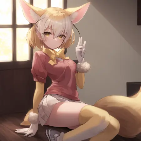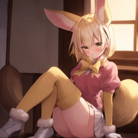 生成标签:feen, 1girl, fennec ears, big ears, solo, blonde hair, short hair, fox tail, yellow bowtie, white pleated skirt, brown eyes, puffy short sleeves, yellow gloves, yellow thigh-highs, pink short-sleeved v-neck sweater, white undershirt, bangs, fox girl, fur trim, yellow neckwear, yellow sleeves, hair between eyes, white shoes, breast pocket