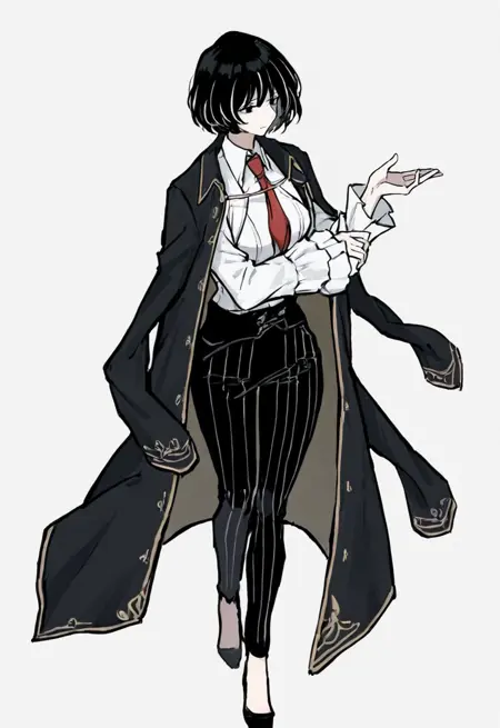 white shirt, black jacket, jacket on shoulders, black pants, red necktie, black footwear