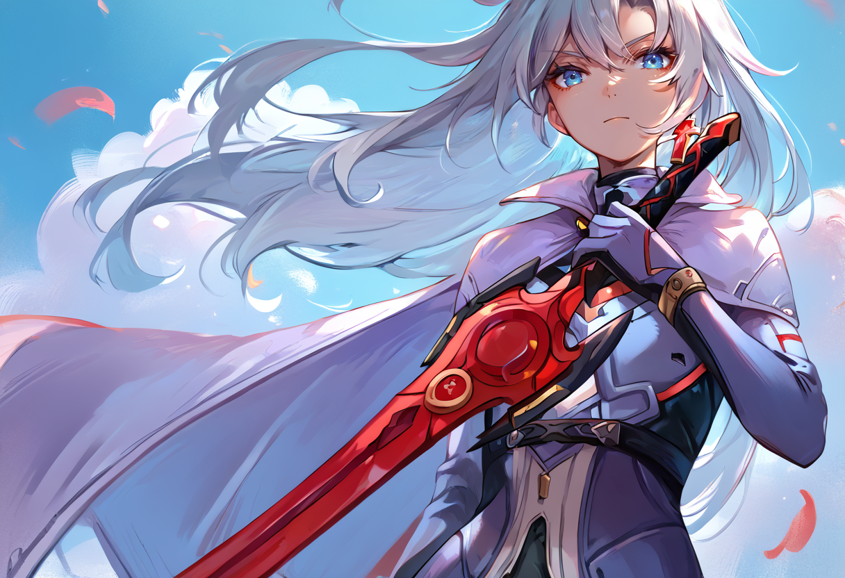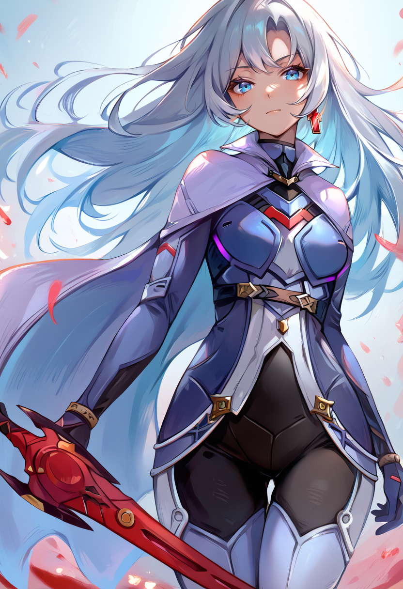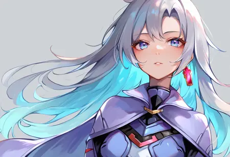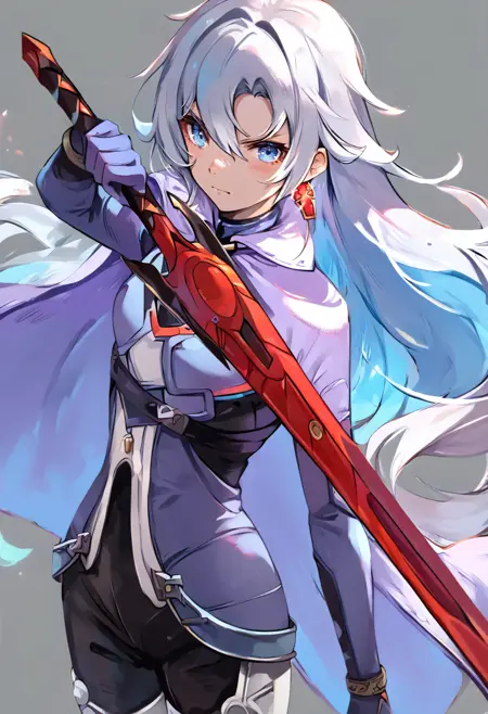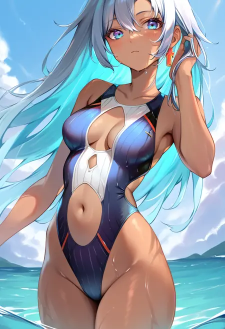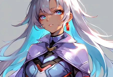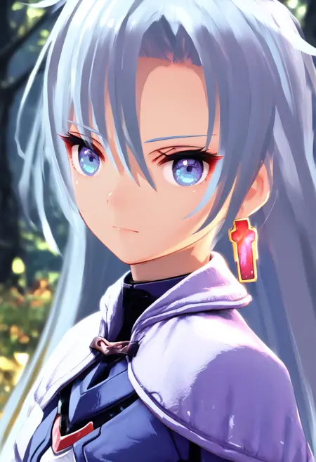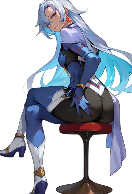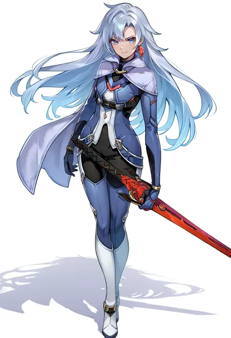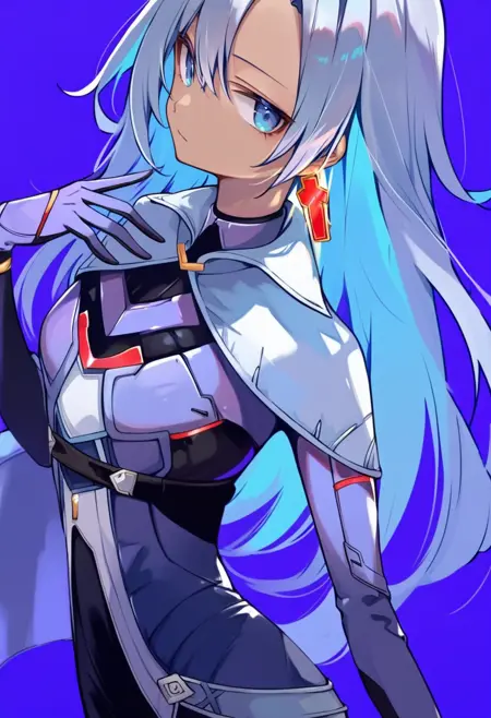 태그(옷): 파란색 바디슈트, 은색 망토, 흰색 허벅지 부츠, 파란 장갑, 단일 십자 귀걸이