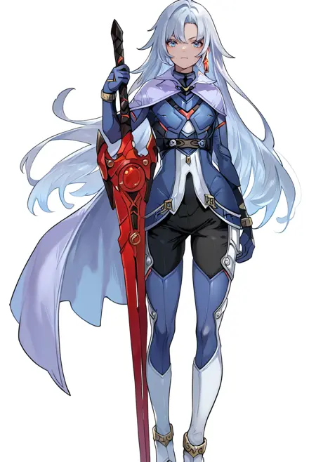 Tags (clothes): blue bodysuit, silver cape, white thigh boots, blue gloves, single cross earring,