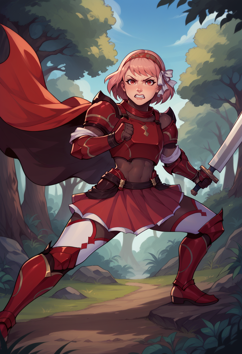 デフォルトの外見: defLapis、短い髪、髪リボン、ツートーンヘアバンド、赤い鎧、胸当て、肩当て、腕甲、ボディーストッキング、赤いスカート、赤いマント、白い太ももまであるストッキング、鎧のブーツ
