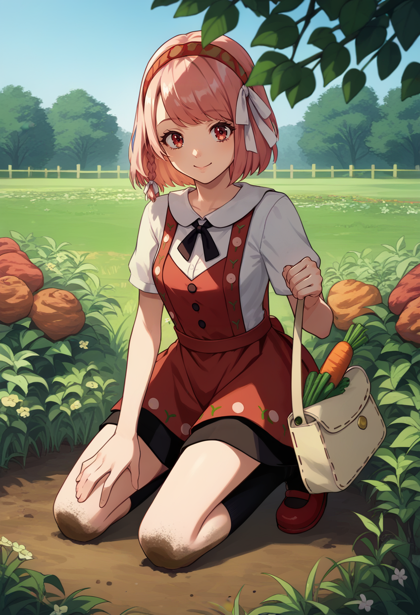 Somnielの衣装: casLapis、短い髪、片側の編み髪、ツートーンヘアバンド、髪リボン、赤いピナフォールドレス、黒い靴下、赤いメイリージャン