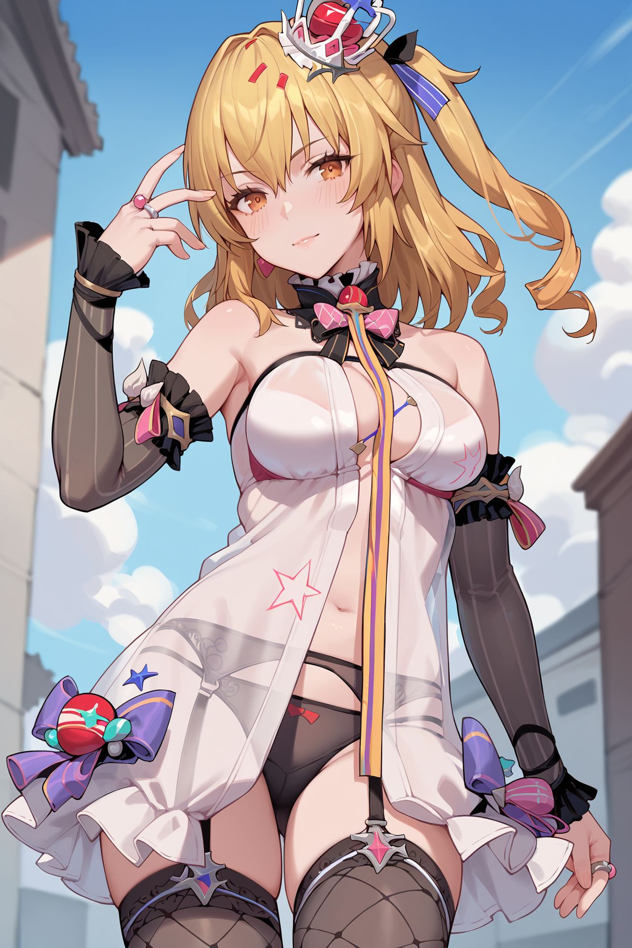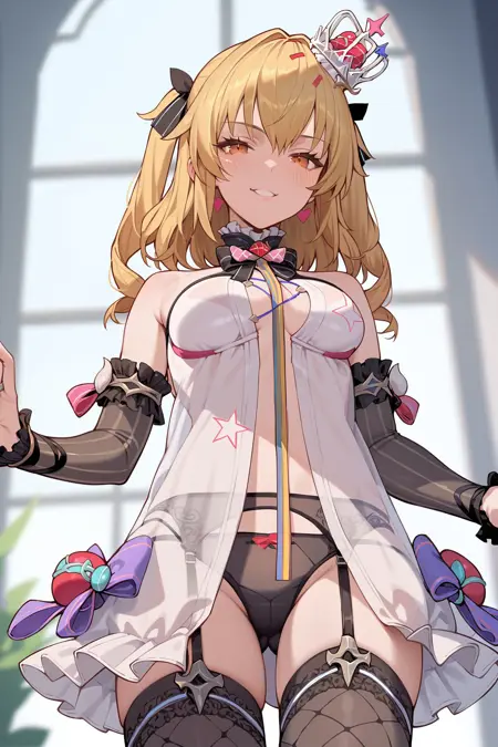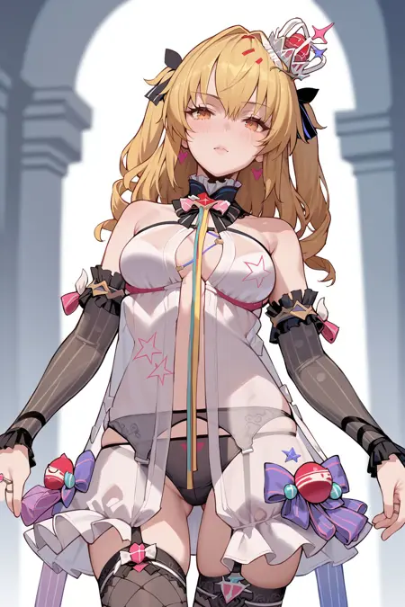 optional, depends on what you'll need: see-through, frills, crown, bow, underwear, thighhighs, garter straps, detached sleeves, medium breasts, ring, shoes