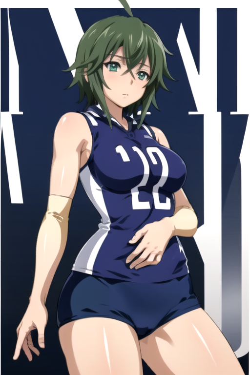 KyochoChuukou, 1girl, solo, short hair, large breasts, hair between eyes, green eyes, green hair, blue shorts, sleeveless, sportswear, elbow pads, blue volleyball uniform