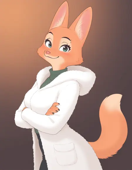 提示: Diane_Foxington,姜黄色皮毛,银色,眉毛穿孔,灰粉色鼻子,狐狸尾巴。