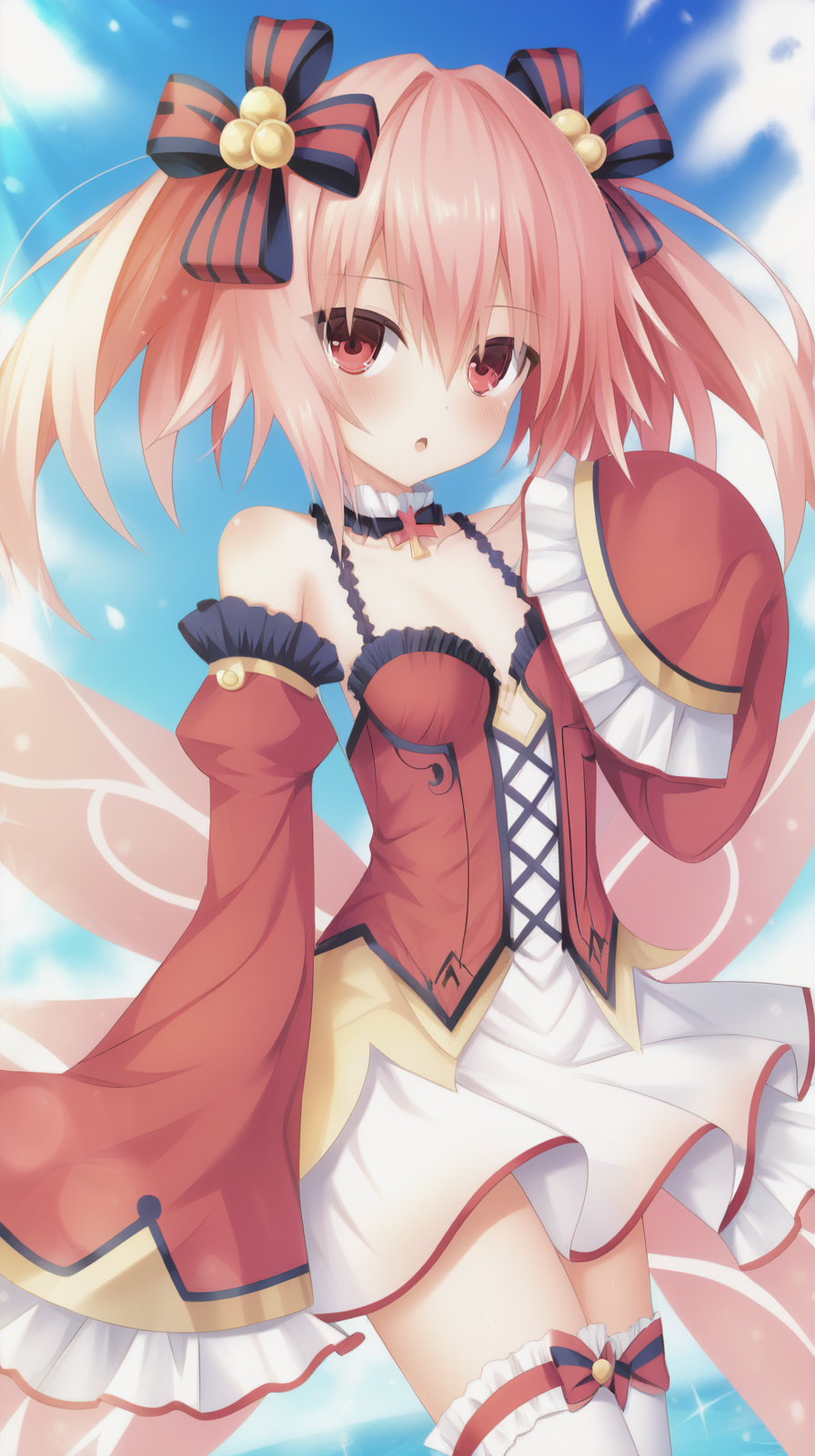 hair ribbons, sleeves, white skirt, white stockings, red eyes, eryn, Red sleeves, Small chest