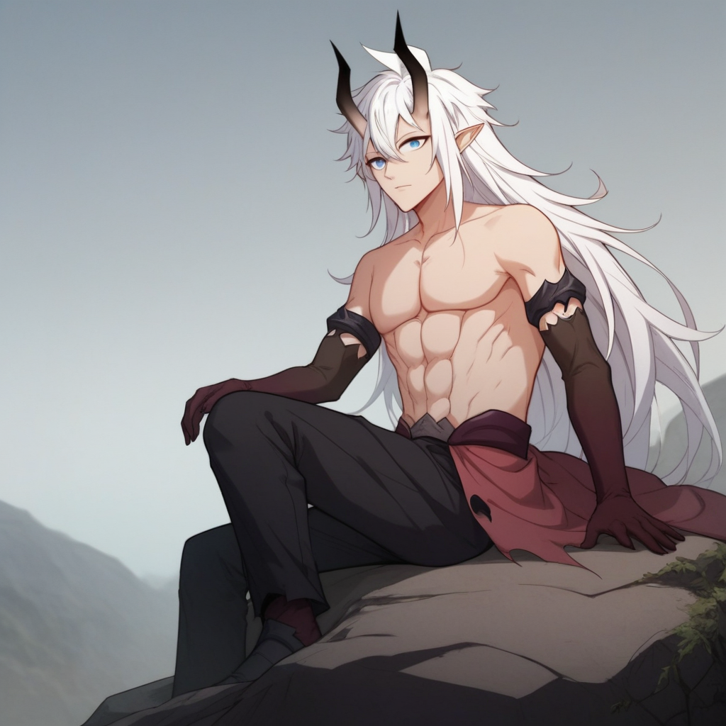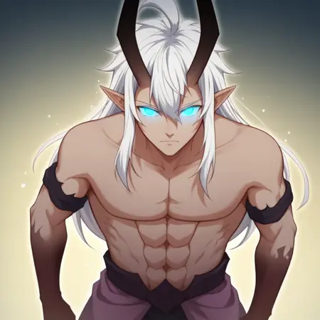 Chenchangan, 1boy, solo, white hair, long hair, blue eyes, horns, pointy ears, topless ,