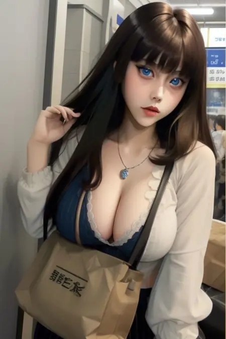 sixgmix,大眼睛,1个女孩,单人,写实,嘴唇,看着观众,长发,棕色头发,棕色眼睛,蓝眼睛,戒指,大胸,珠宝,鼻子,肖像,微笑,闭嘴,黑发,黑眼睛,发带,项链,衬衫,看向一侧