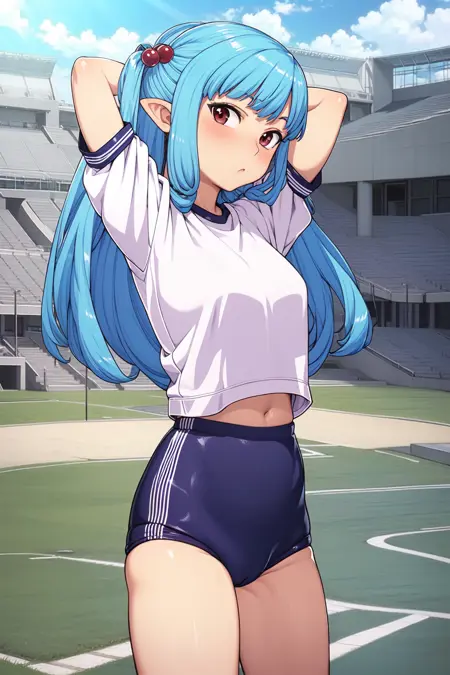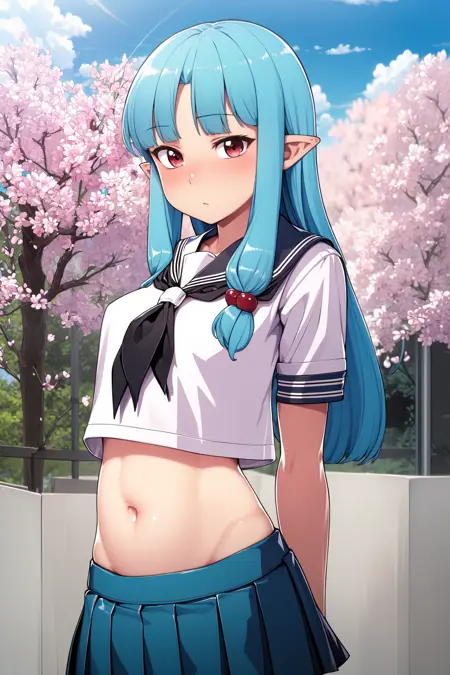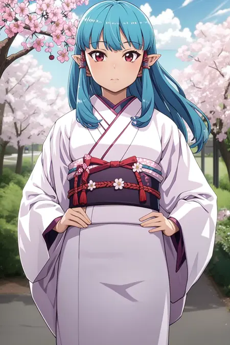 appearance: kiriha, red eyes, blue hair, long hair, blunt bangs, hair bobbles, pointy ears