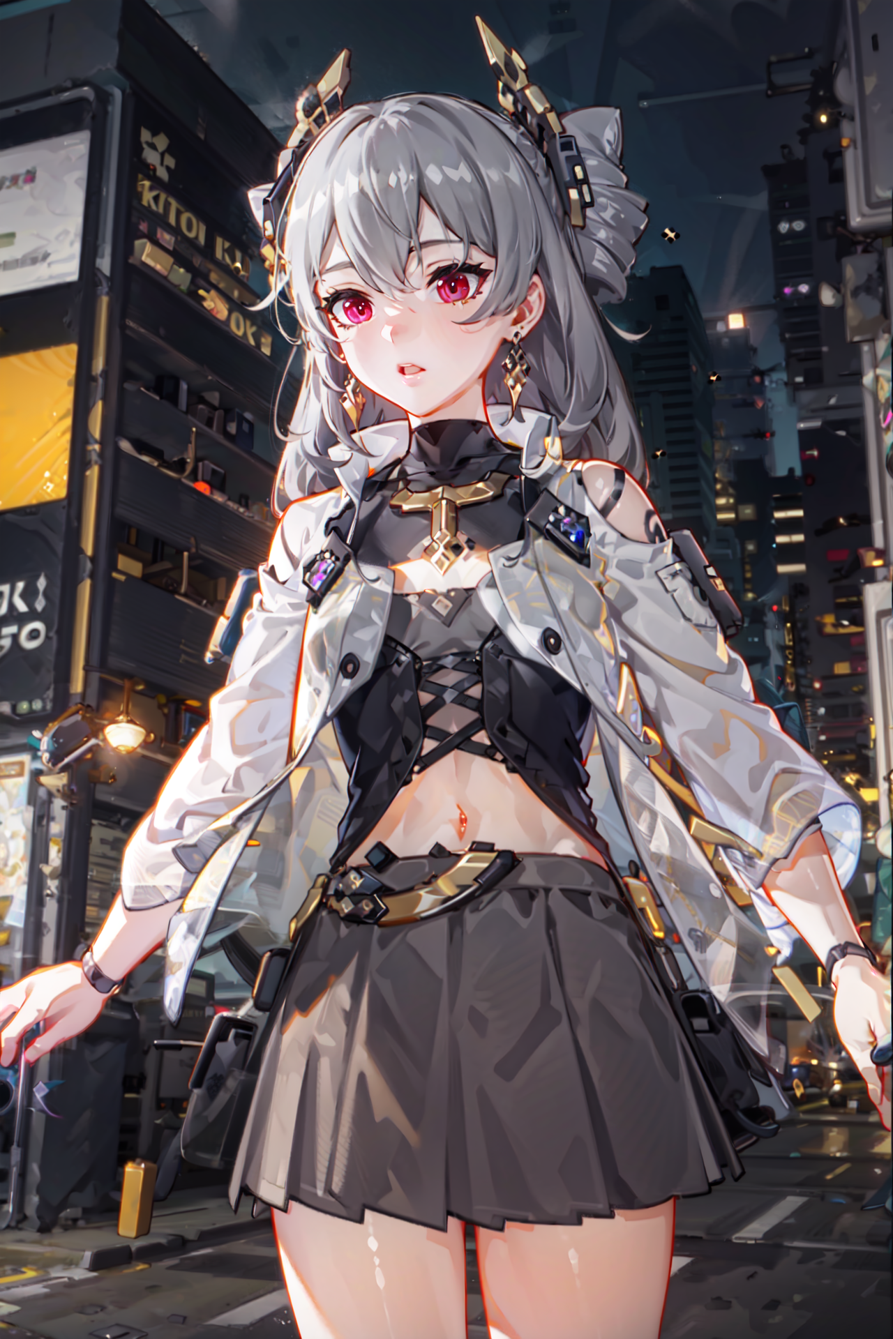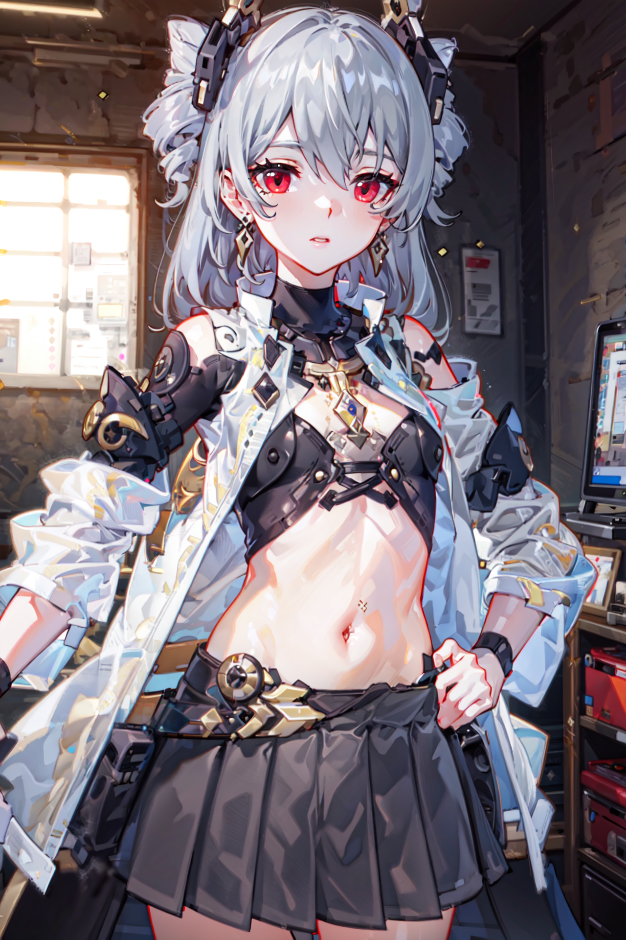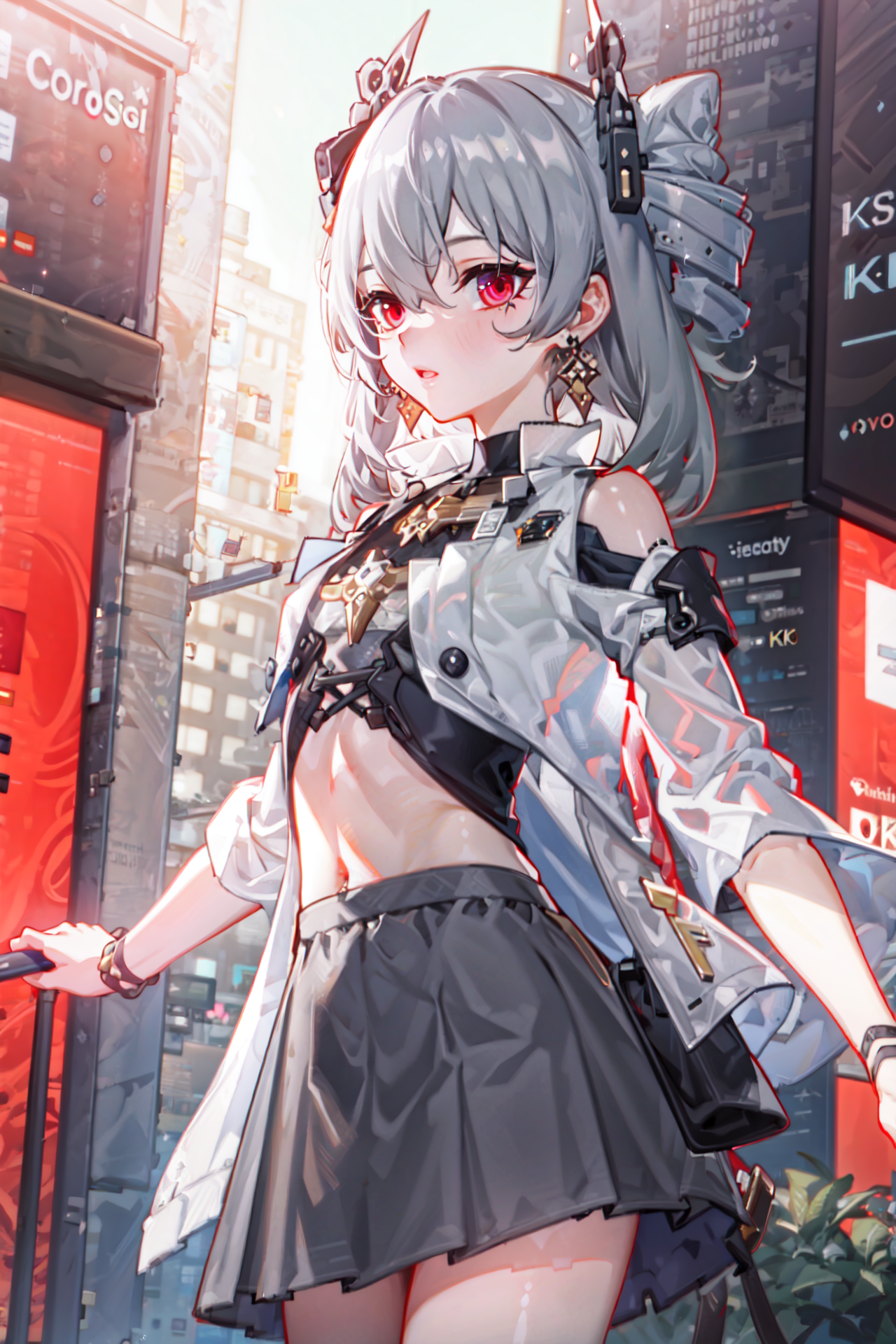 white footwear, grey skirt, earrings, doll joints, hair ornament, jacket, midriff, twin drills