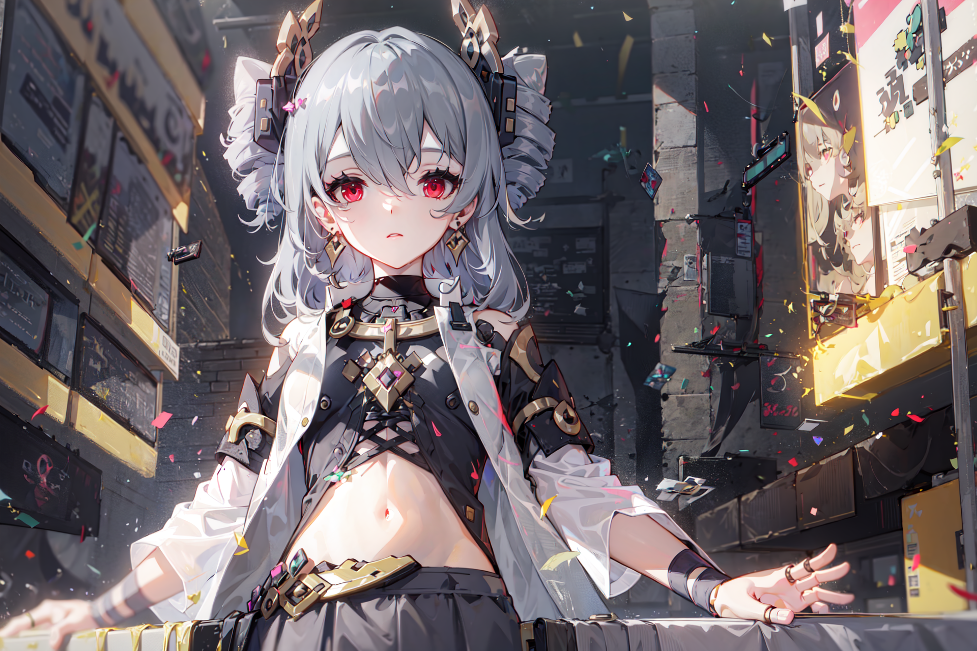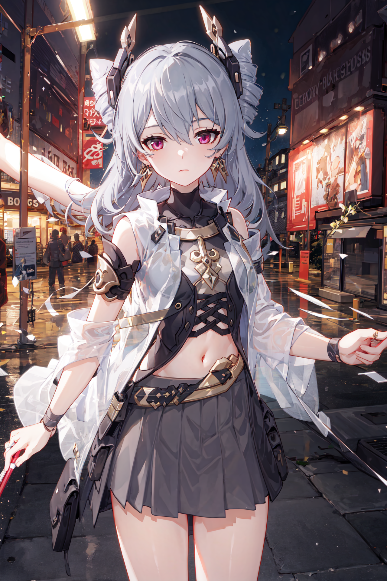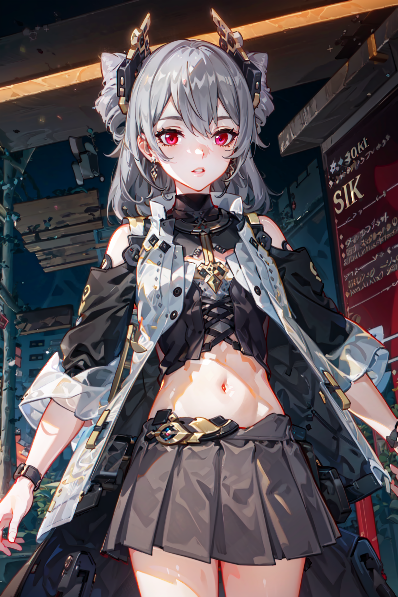 white footwear, grey skirt, earrings, doll joints, hair ornament, jacket, midriff, twin drills