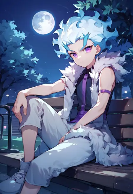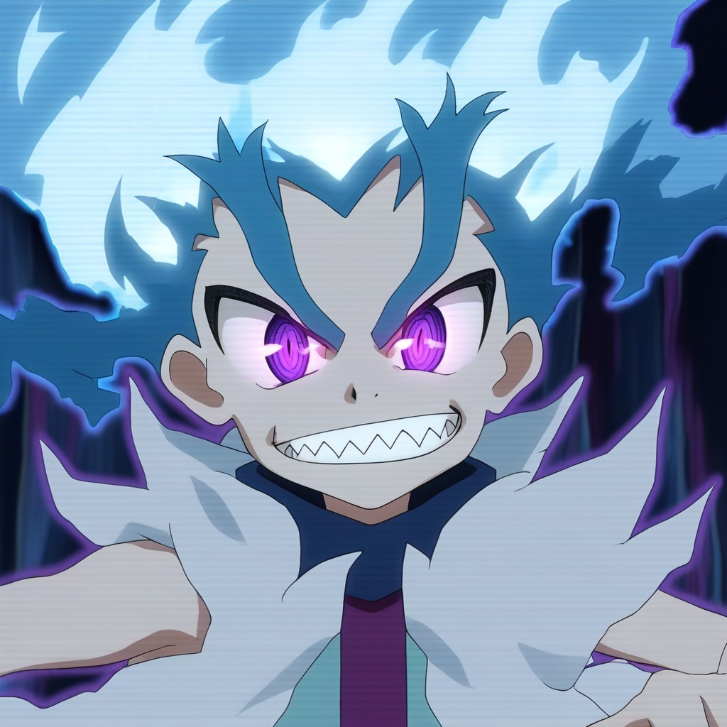 flame-shaped hair, fire-shaped hair, pale-skinned, boy with light-blue and white hair, violet eyes, aura, 3 rings in the eye, ringed eyes, sharp teeth,