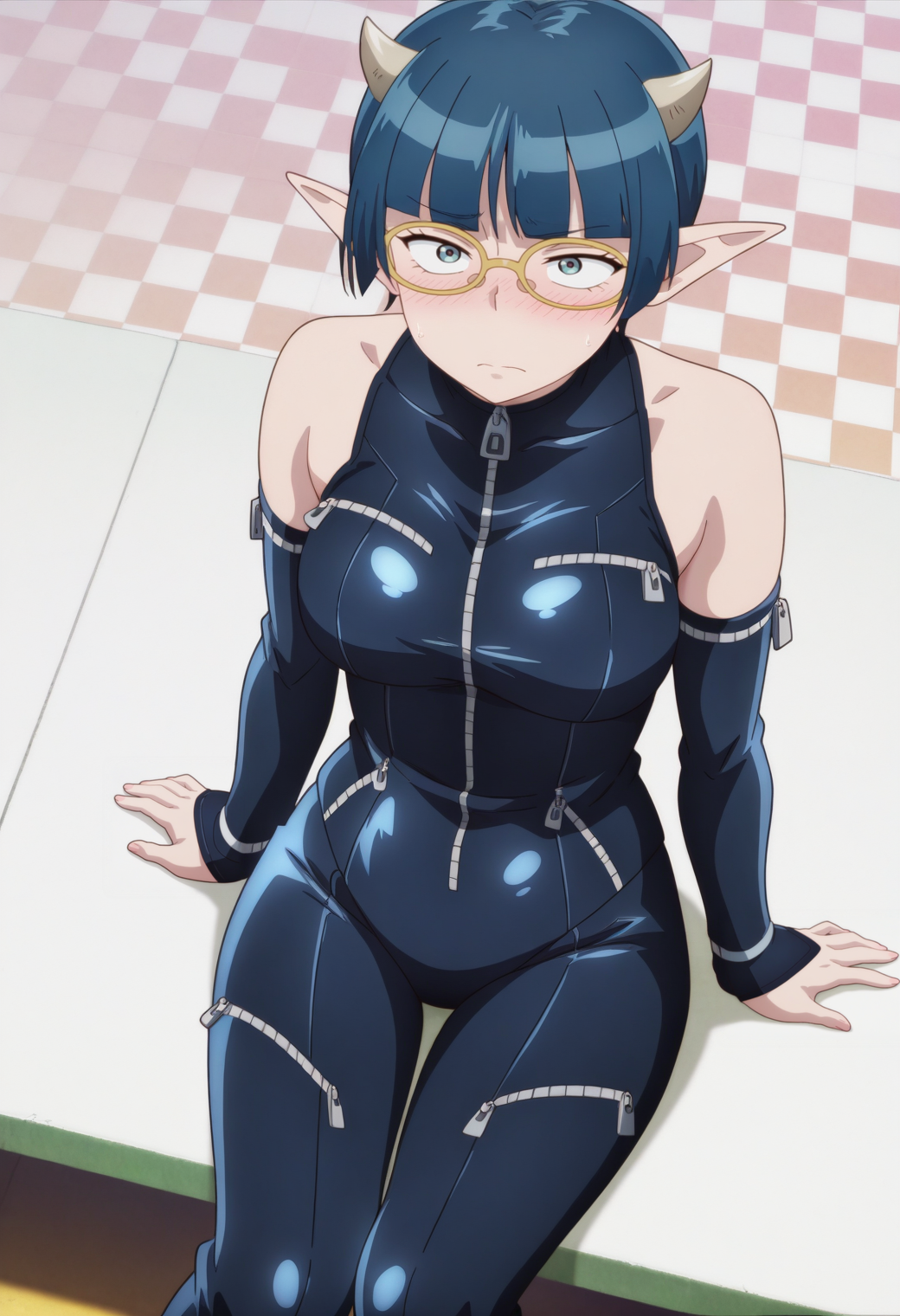 zenia, blue hair, short hair, blunt bangs, horns, pointy ears, blue eyes,