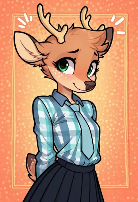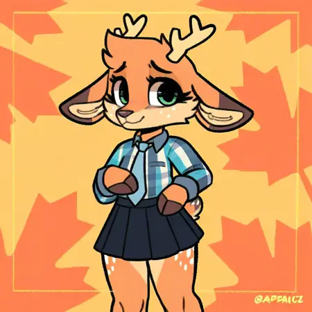 maple, deer, furry female, freckles, deer ears, antlers, blue flannel shirt, necktie, skirt, green eyes