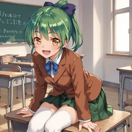 茶色のジャケット、緑のスカート、白の太ももハイズ、