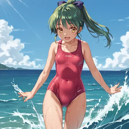 ai_aihara、緑の髪、黄色い目、ポニーテール、髪リボン、