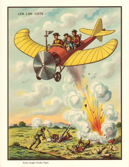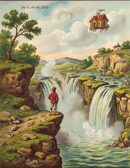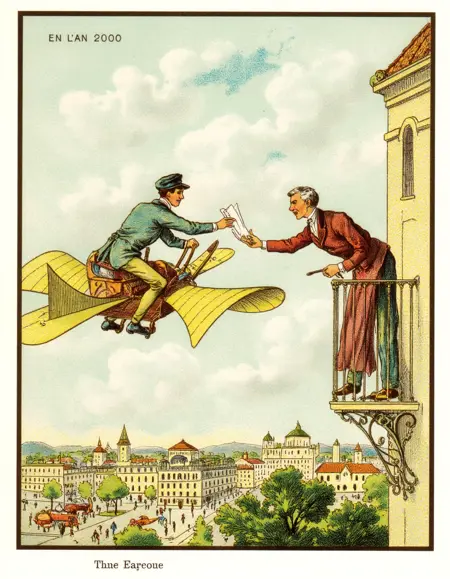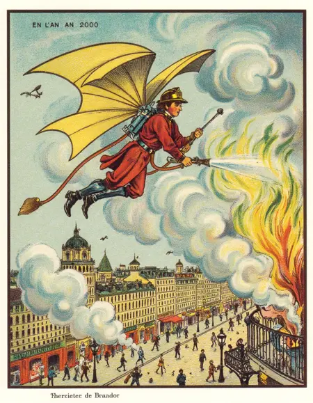 Jean-Marc Cote 스타일로 그린, 날개를 달고 소방호스를 들고 도시 위를 날고 있는 소방관의 그림
