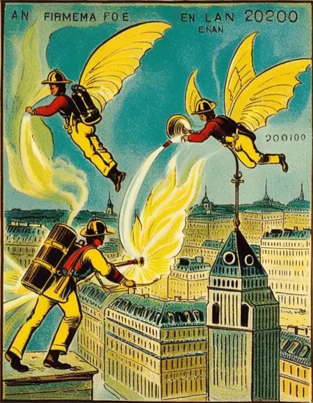 a painting of a fireman with wings flying holding a firehose over a city in the style of jean-marc-cote