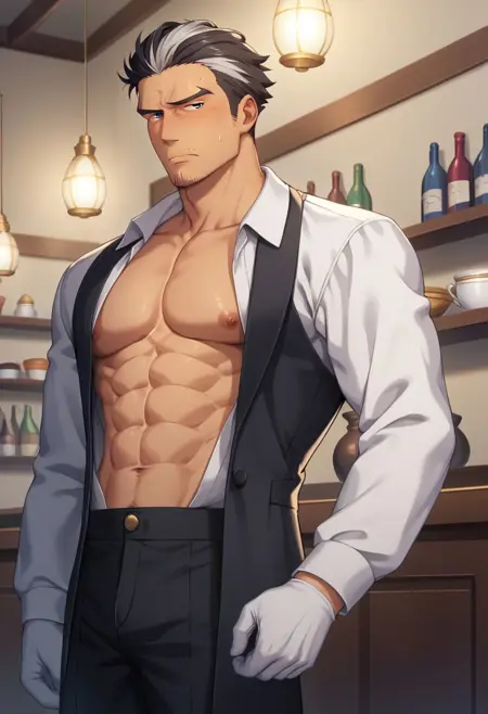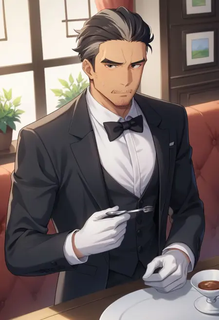 butler, formal, black tuxedo, white shirt, black bowtie, black jacket, black pants, white gloves, monocle, eye glass