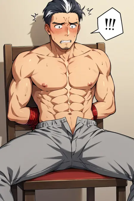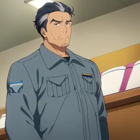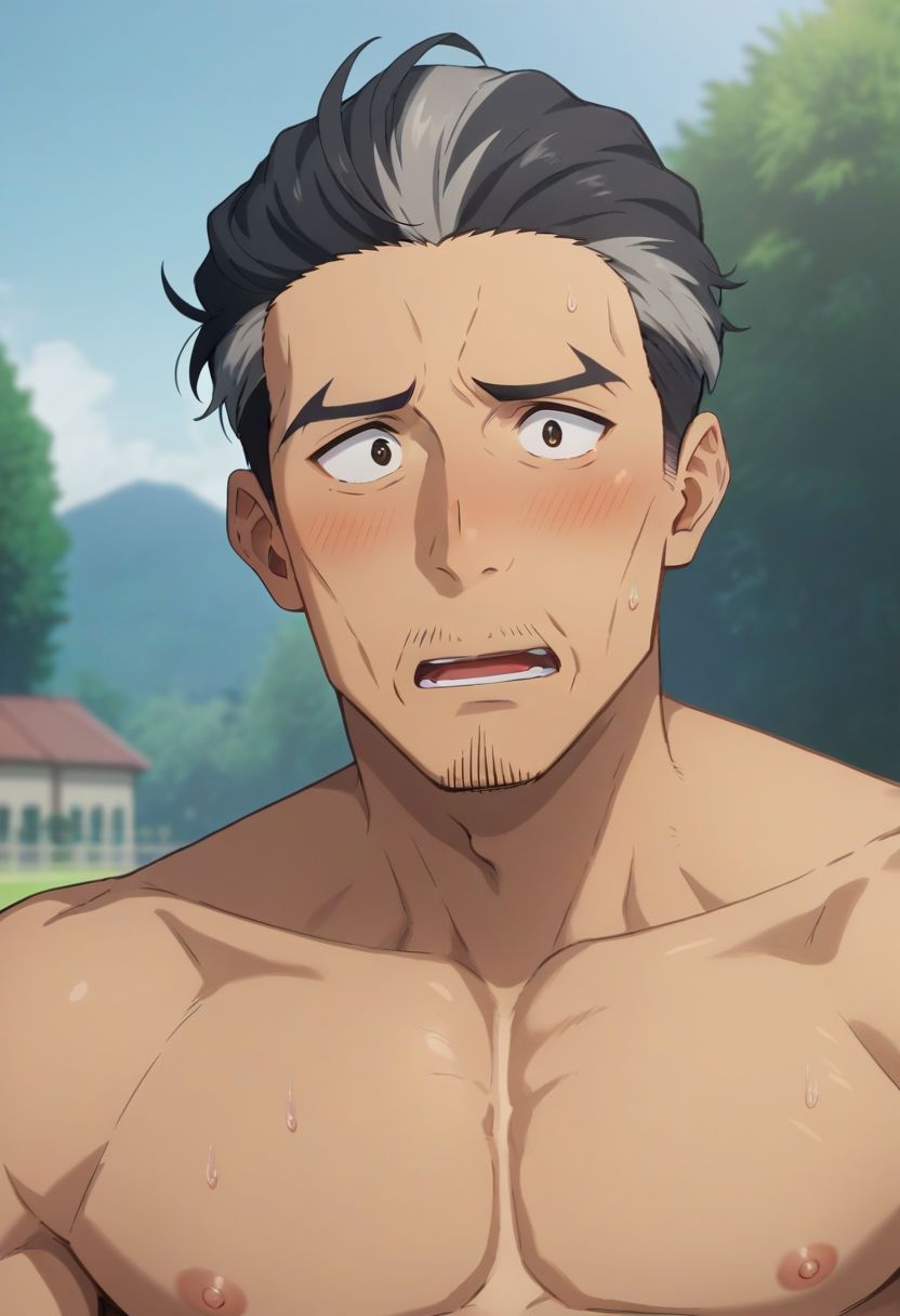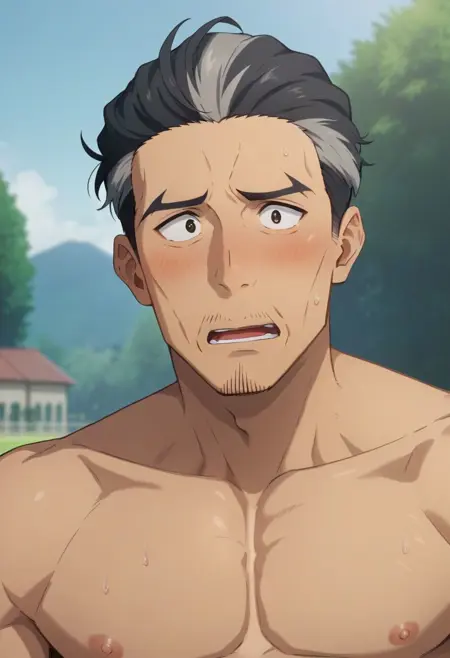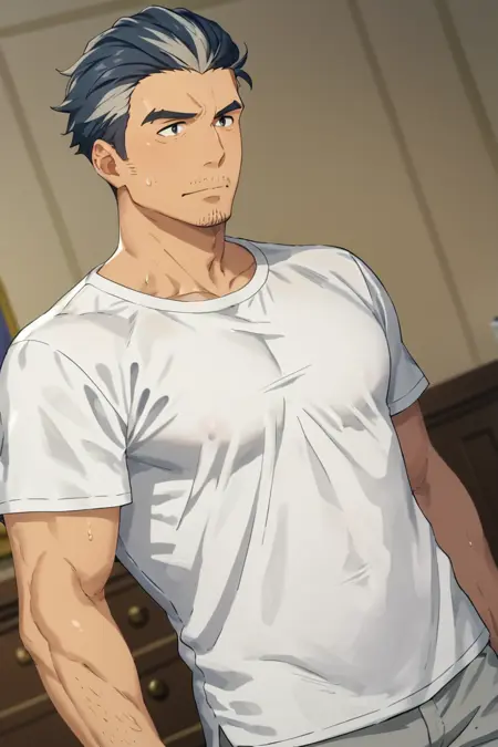 Isao Kawada, streaked hair, slicked back hairstyle, facial hair, stubble, black eyes