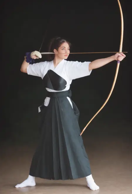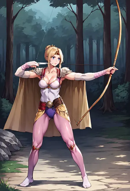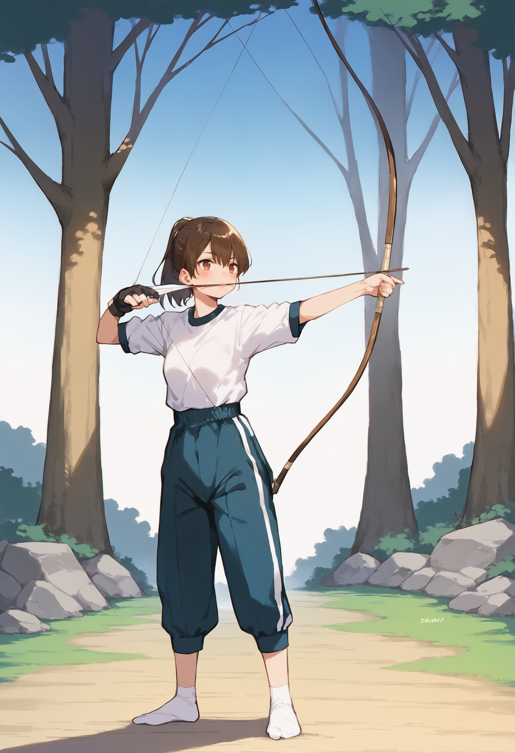 트리거 단어: kyudo-aiming, aiming, arrow (projectile), bow (weapon), drawing bow, holding arrow, holding bow (weapon), partially fingerless gloves, yugake