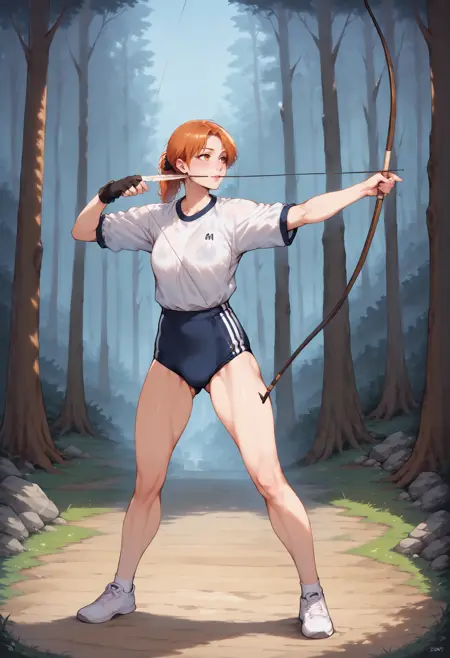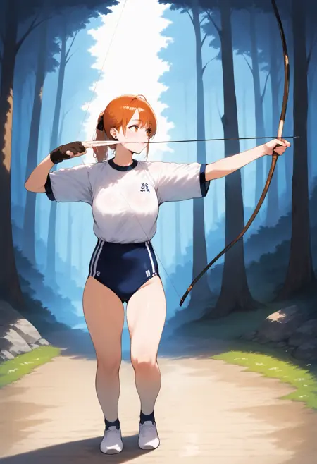 トリガー語: kyudo-aiming, aiming, arrow (projectile), bow (weapon), drawing bow, holding arrow, holding bow (weapon), partially fingerless gloves, yugake