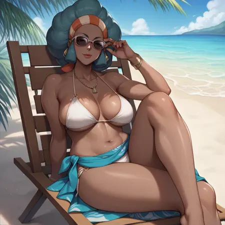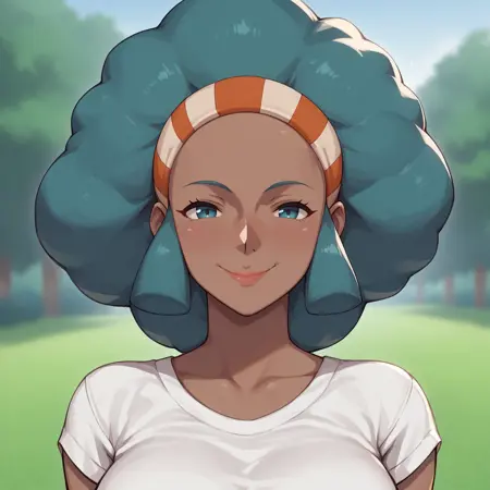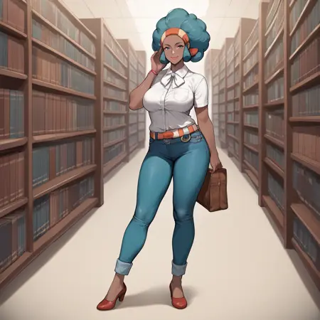 트리거: Lenora_BW, (옵션: 검은 피부의 여자, 흰 셔츠, 플레어 청바지, 벨트, 빨간 평탄한 신발)