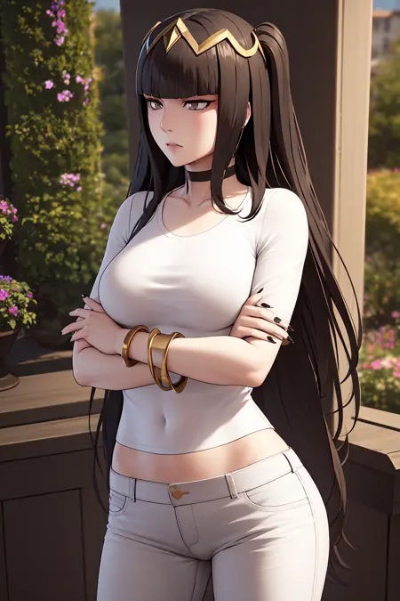 이 캐릭터를 프롬프트할 때는 "lora:TharjaFE:strength타르자, 골드 라인이 들어간 바디스튜킹, 골드 목줄, 골드 루인클로스, 헤어 액세서리, 캡, 하이힐"을 입력하세요. <화염의 영웅: 전사들>의 가벼운 3D 아트 스타일을 사용하고 싶을 경우 "3D Model"로 프롬프트할 수 있습니다.