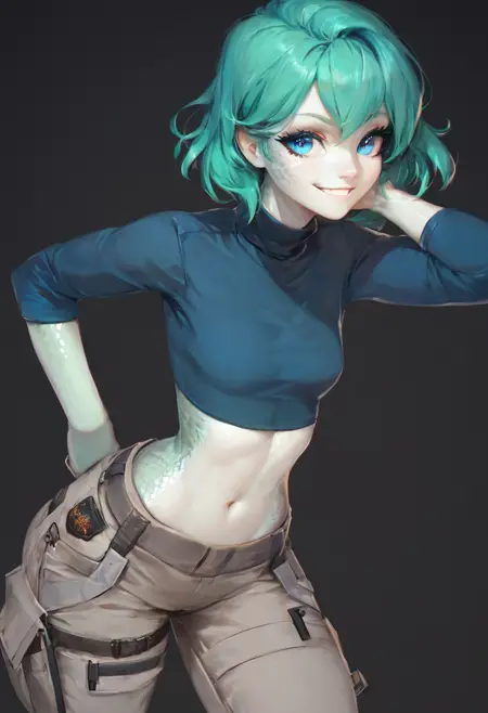 1girl, 纯白色蜥蜴皮肤, ((纯白色苍白皮肤,)), 短cyan色头发